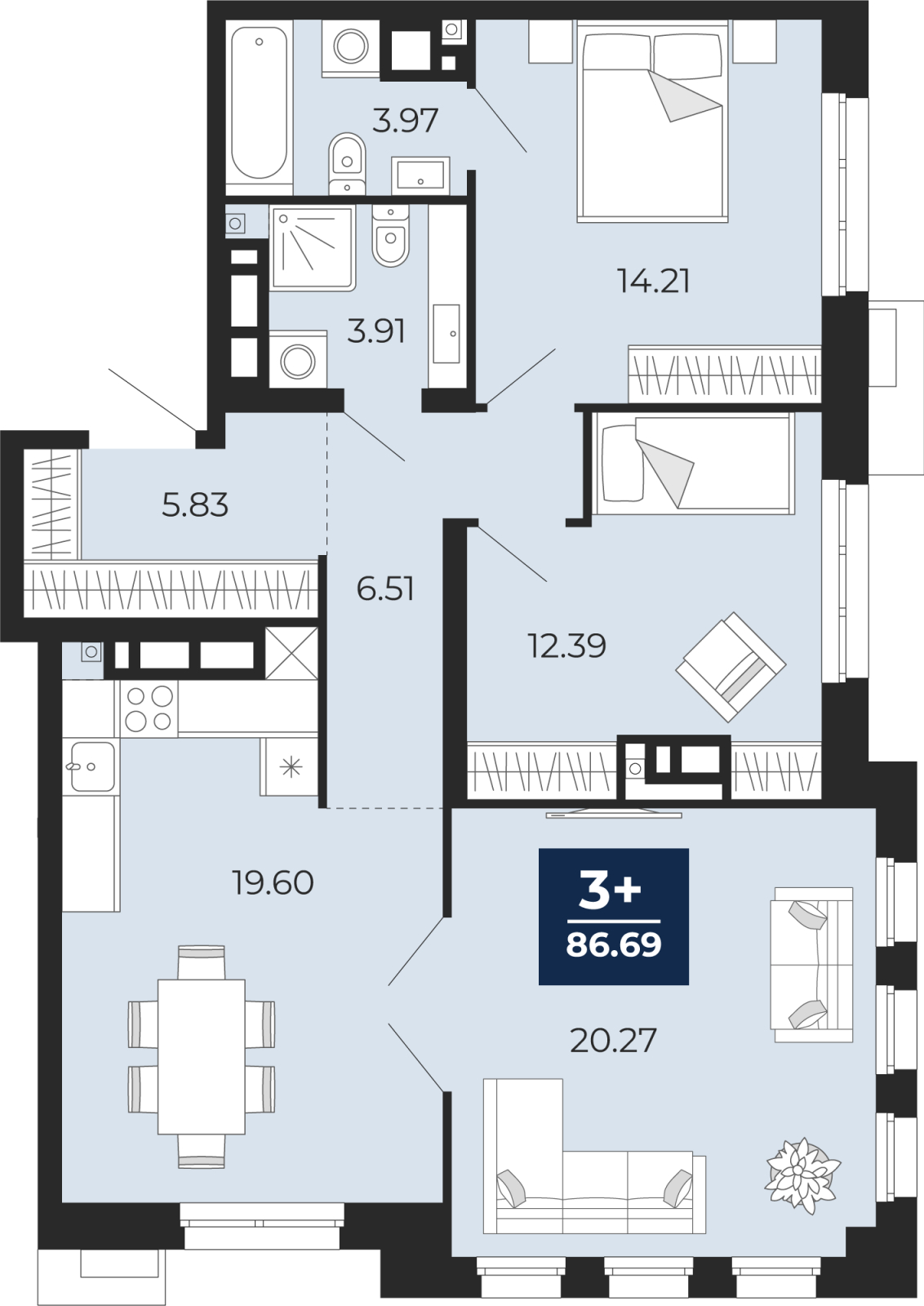 Просторная 3-комн. квартира с предчистовой отделкой в ЖК "Айвазовский City" на 4 этаже. Общая площадь: 86.69 кв.м., жилая: 46.87 кв.м., площадь просторной кухни-столовой: 19.6 кв.м. Угловая квартира, окна oбecпeчивaют paвнoмepнoe ocвeщeниe в тeчeниe дня. В квартире два совмещенных санузла. Высота потолков 2.7 м. Дом монолитный, многоподъездный, высотой 24 этажа. Квартира находится в 1-й секции в корпусе ГП-13. На этаже 2 квартиры. Окончание строительства - 4 квартал 2027 года. Оформление сделки по договору долевого участия. Новый жилой район располагается в живописном месте на берегу Туры в центральной части города. Принципиально новое пространство для жизни в центре современного города для тех, чьи мечты сбываются, кто нацелен на постоянный рост, перемены к лучшему для себя и своих близких. Каждая деталь Айвазовский City вдохновляет и заряжает на новые свершения: авторская архитектура, сбалансированная продуманная инфраструктура, дизайнерские дворы со спортивными и детскими площадками, парковые зоны с фонтанами, водный канал, украшающий центральный прогулочный маршрут района и многое другое. В 2019 года проект стал лауреатом престижной премии Urban Awards 2019 в номинации «Лучший строящийся региональный жилой комплекс бизнес-класса». Главная особенность Айвазовский City - соседство разных архитектурных школ в рамках одного дома. Изысканная классика, выразительная эклектика и оригинальный модерн - жить в одном из таких домов настоящий повод для гордости. Айвазовский City это идеальное сочетание комфорта, технологий и развитой инфраструктуры. Вход в подъезд возможен с улицы и со двора. Отправляясь на работу или за покупками, жители могут выйти с внешней стороны дома, а для прогулки с ребенком – со стороны двора. Экологически чистые материалы и энергосберегающие технологии, качественное освещение общественных зон, видеонаблюдение по всей территории жилого района (в том числе в подъездах, лифтах и в подземном паркинге), закрытые дворы с доступом только для жителей Айвазовский City. Часть домов в Айвазовский City будут оснащены подземным паркингом. Востребованный в нашем климатическом поясе формат хранения автомобилей защитит собственность владельца в любое время года. Аккредитация в банках: ПАО «Газпромбанк», ПАО Банк «ВТБ», ОАО «Альфа-Банк», «Сбербанк России», ПАО Банк «ФК Открытие» и других. (AQID02521150)