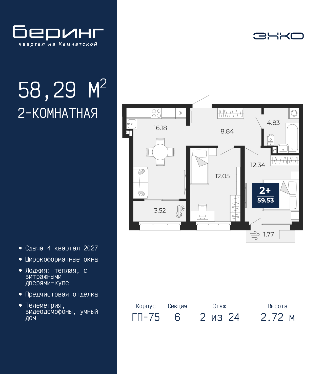 Продается 2-комн. квартира с предчистовой отделкой в ЖК "Беринг" на 2 этаже. Общая площадь: 58.29 кв.м., жилая: 24.39 кв.м., площадь просторной кухни-столовой: 16.18 кв.м. Комнаты изолированные, все окна выходят на одну сторону. В квартире один балкон и одна лоджия, один совмещенный санузел. Высота потолков 2.72 м. Дом монолитный, многоподъездный, переменной этажности, от 17 до 24 этажей. Квартира находится в 6-й секции высотой 24 этажа в корпусе ГП-75. На этаже 6 квартир. В подъезде 2 пассажирских и 1 грузовой лифт. Окончание строительства - 4 квартал 2027 года. Оформление сделки по договору долевого участия. Подобно знаменитому исследователю, мы чувствуем себя первооткрывателями этой локации. Хотим показать новую суть места, сформировать для вас жизненный опыт, которого ещё не было. Беринг — район зелёного цвета. Беринг — район, который откроется вам с другой стороны. Впечатлит новым уровнем комфорта и качеством жизни. Беринг — открытие на карте города. Первый квартал расположен в районе Тура, в границах улиц: Камчатская – Западносибирская – Энтузиастов. Вокруг уже есть всё для того, чтобы ежедневная рутина была лишь частью жизни и не доставляла дискомфорта. Школы и детские сады, магазины и аптеки, поликлиника, места для семейного отдыха, пеших и велопрогулок, и даже рыбалки. Масштабное озеленение дворов — визитная карточка ЭНКО и ваш оазис спокойствия, чтобы отвлечься от повседневности. Раскидистые деревья, кустарники, травы и цветы — осталось остановиться, вдохнуть и расслабиться, глядя на эту природную красоту. Стилистика подъездов продолжает концепцию Беринга, вдохновлённого Камчаткой: сдержанный, но при этом впечатляющий дизайн соседствует с удобством и функциональностью. (AQID02529683)