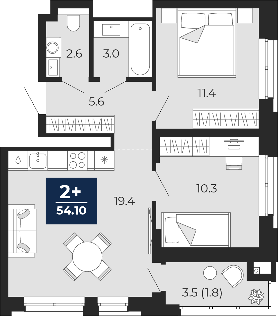 2-комн. квартира с предчистовой отделкой в ЖК "Мириады" на 5 этаже. Общая площадь: 54.1 кв.м., жилая: 22.5 кв.м., площадь просторной кухни-столовой: 17.2 кв.м. Комнаты изолированные, все окна выходят на одну сторону. В квартире одна лоджия, один совмещенный и один раздельный санузел. Высота потолков 2.7 м. Дом монолитный, многоподъездный, переменной этажности, от 14 до 16 этажей. Квартира находится в 5-й секции высотой 14 этажей в корпусе ГП-72.102. На этаже 8 квартир. В подъезде 1 пассажирский и 1 грузовой лифт. Окончание строительства - 4 квартал 2025 года. Оформление сделки по договору долевого участия. Вселенная бесконечных историй. Ранее невиданный Тюмени масштаб: территория 240 гектаров и 1 650 000 м² застройки. Мириады – это город масштабных перемен и больших возможностей. Город зеленых рощ и зеркальных озер. Город для работы, учебы и развлечений. Город для детей и их родителей. Город для всех и каждого. Проект расположен в районе Мыс рядом с ТРЦ «Тюмень Сити Молл» в границах улицы Тимофея Чаркова, Тобольского тракта и объездной дороги. Срок полного освоения территории - до 2034 года. (AQID02536571)