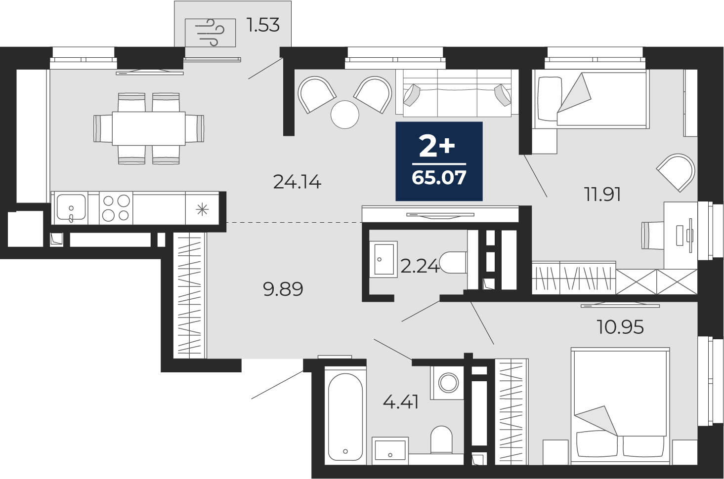 - Жилая площадь 22.86 м²
