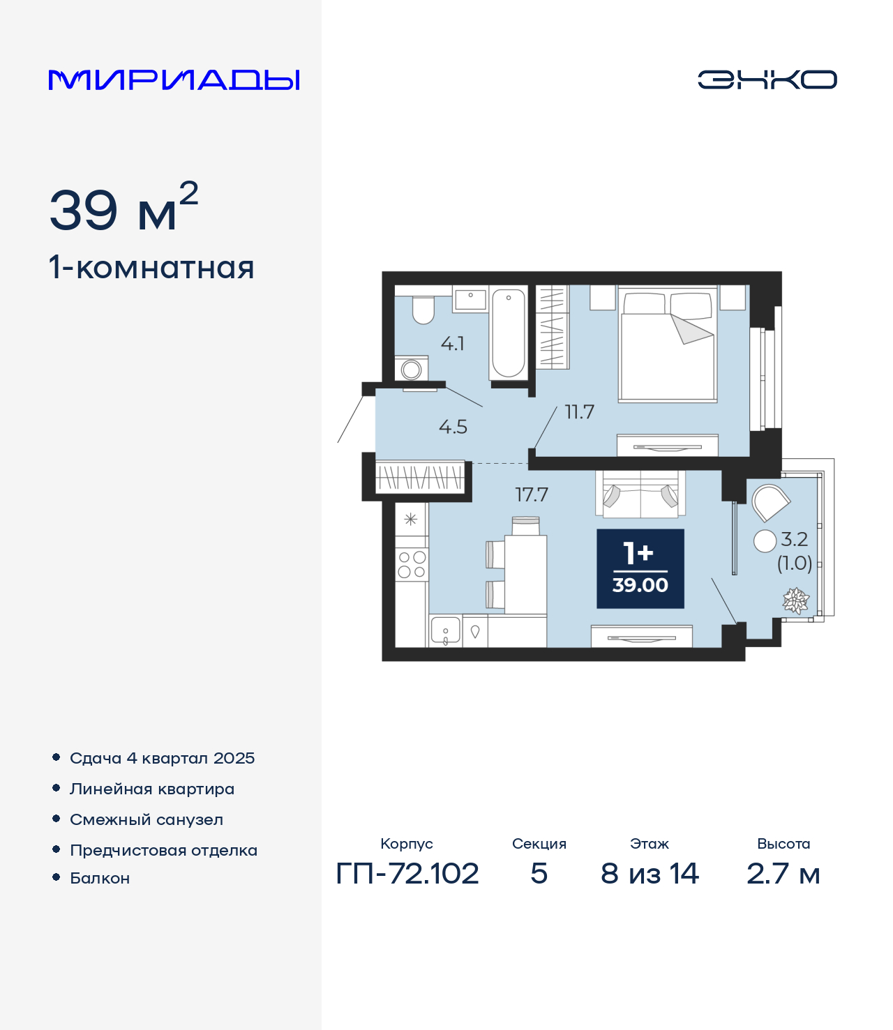1-комн. квартира с предчистовой отделкой в ЖК "Мириады" на 8 этаже. Общая площадь: 39 кв.м., жилая: 11.7 кв.м., площадь просторной кухни-столовой: 17.7 кв.м. Все окна выходят на одну сторону. В квартире один балкон, один совмещенный санузел. Высота потолков 2.7 м. Дом монолитный, многоподъездный, переменной этажности, от 14 до 16 этажей. Квартира находится в 5-й секции высотой 14 этажей в корпусе ГП-72.102. На этаже 8 квартир. В подъезде 1 пассажирский и 1 грузовой лифт. Окончание строительства - 4 квартал 2025 года. Оформление сделки по договору долевого участия. Вселенная бесконечных историй. Ранее невиданный Тюмени масштаб: территория 240 гектаров и 1 650 000 м² застройки. Мириады – это город масштабных перемен и больших возможностей. Город зеленых рощ и зеркальных озер. Город для работы, учебы и развлечений. Город для детей и их родителей. Город для всех и каждого. Проект расположен в районе Мыс рядом с ТРЦ «Тюмень Сити Молл» в границах улицы Тимофея Чаркова, Тобольского тракта и объездной дороги. Срок полного освоения территории - до 2034 года. (AQID02522614)