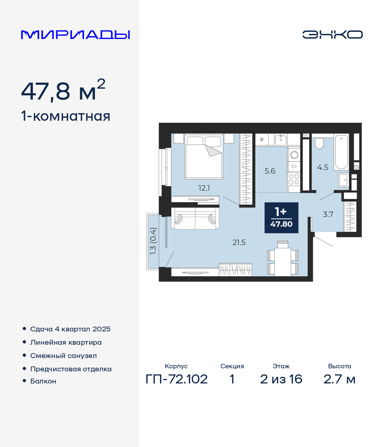 Просторная 1-комн. квартира с предчистовой отделкой в ЖК "Мириады" на 2 этаже. Общая площадь: 47.8 кв.м., жилая: 12.1 кв.м., площадь просторной кухни-столовой: 27.1 кв.м. Все окна выходят на одну сторону. В квартире один балкон, один совмещенный санузел. Высота потолков 2.7 м. Дом монолитный, многоподъездный, переменной этажности, от 14 до 16 этажей. Квартира находится в 1-й секции высотой 16 этажей в корпусе ГП-72.102. На этаже 9 квартир. В подъезде 1 пассажирский и 1 грузовой лифт. Окончание строительства - 4 квартал 2025 года. Оформление сделки по договору долевого участия. Вселенная бесконечных историй. Ранее невиданный Тюмени масштаб: территория 240 гектаров и 1 650 000 м² застройки. Мириады – это город масштабных перемен и больших возможностей. Город зеленых рощ и зеркальных озер. Город для работы, учебы и развлечений. Город для детей и их родителей. Город для всех и каждого. Проект расположен в районе Мыс рядом с ТРЦ «Тюмень Сити Молл» в границах улицы Тимофея Чаркова, Тобольского тракта и объездной дороги. Срок полного освоения территории - до 2034 года. (AQID02522789)