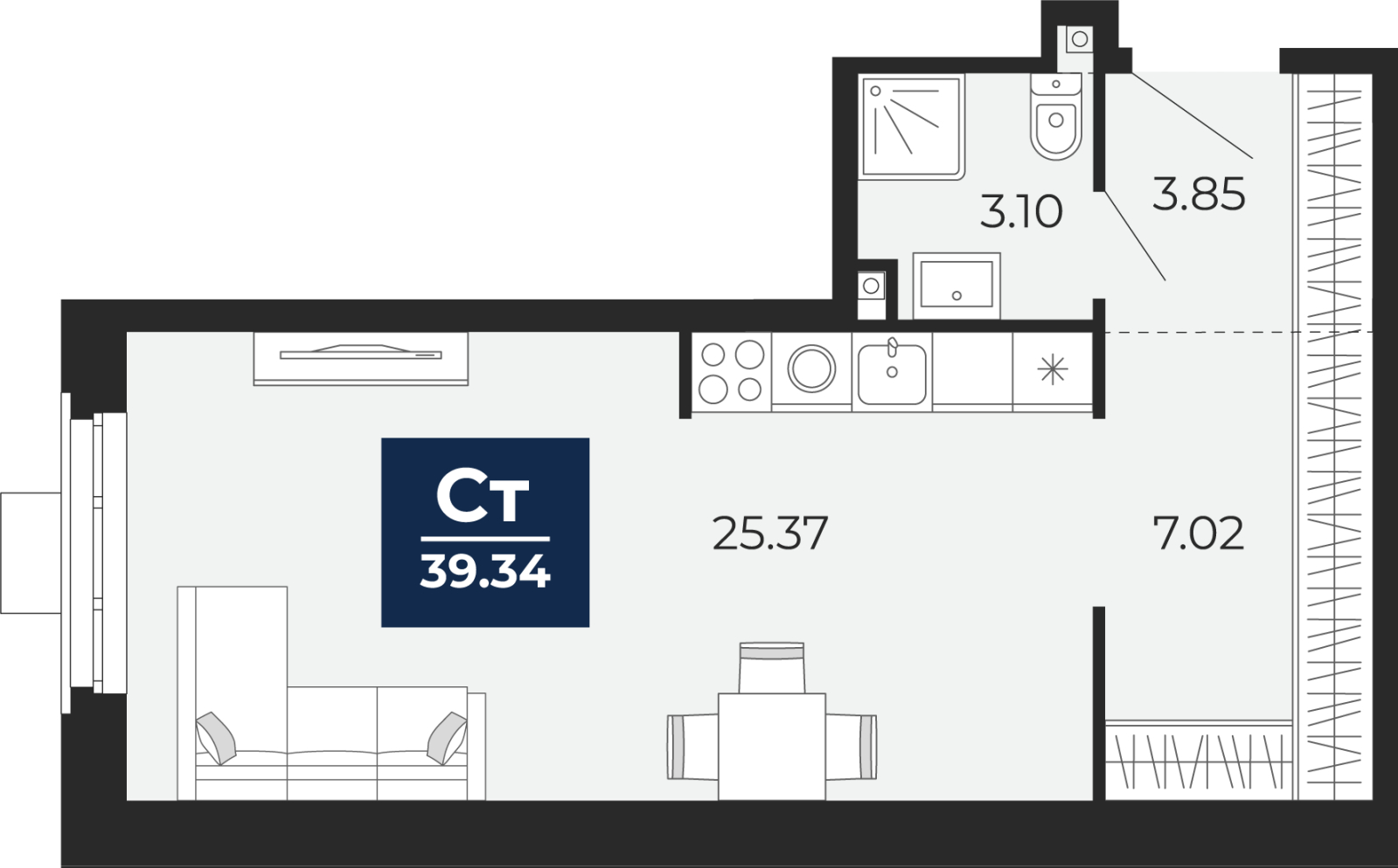 - Общая площадь 39.34 м²