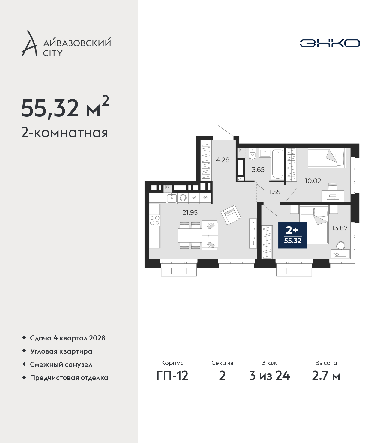 Продается двухкомнатная квартира с предчистовой отделкой в ЖК "Айвазовский City" на 3 этаже. Общая площадь: 55.32 кв.м., жилая: 23.89 кв.м., площадь просторной кухни-столовой: 21.95 кв.м. Угловая квартира, идеально подойдет любителям тишины и панорамных видов. В квартире один совмещенный санузел. Высота потолков 2.7 м. Дом монолитный, многоподъездный, высотой 24 этажа. Квартира находится во 2-й секции в корпусе ГП-12. На этаже 6 квартир. В подъезде 1 пассажирский и 1 грузовой лифт. Окончание строительства - 4 квартал 2028 года. Оформление сделки по договору долевого участия. Новый жилой район располагается в живописном месте на берегу Туры в центральной части города. Принципиально новое пространство для жизни в центре современного города для тех, чьи мечты сбываются, кто нацелен на постоянный рост, перемены к лучшему для себя и своих близких. Каждая деталь Айвазовский City вдохновляет и заряжает на новые свершения: авторская архитектура, сбалансированная продуманная инфраструктура, дизайнерские дворы со спортивными и детскими площадками, парковые зоны с фонтанами, водный канал, украшающий центральный прогулочный маршрут района и многое другое. В 2019 года проект стал лауреатом престижной премии Urban Awards 2019 в номинации «Лучший строящийся региональный жилой комплекс бизнес-класса». Главная особенность Айвазовский City - соседство разных архитектурных школ в рамках одного дома. Изысканная классика, выразительная эклектика и оригинальный модерн - жить в одном из таких домов настоящий повод для гордости. Айвазовский City это идеальное сочетание комфорта, технологий и развитой инфраструктуры. Вход в подъезд возможен с улицы и со двора. Отправляясь на работу или за покупками, жители могут выйти с внешней стороны дома, а для прогулки с ребенком – со стороны двора. Экологически чистые материалы и энергосберегающие технологии, качественное освещение общественных зон, видеонаблюдение по всей территории жилого района (в том числе в подъездах, лифтах и в подземном паркинге), закрытые дворы с доступом только для жителей Айвазовский City. Часть домов в Айвазовский City будут оснащены подземным паркингом. Востребованный в нашем климатическом поясе формат хранения автомобилей защитит собственность владельца в любое время года. Аккредитация в банках: «Сбербанк России», ПАО Банк «ВТБ», ОАО «Альфа-Банк», ПАО «Газпромбанк», ПАО «Совкомбанк» и других. (AQID02525673)