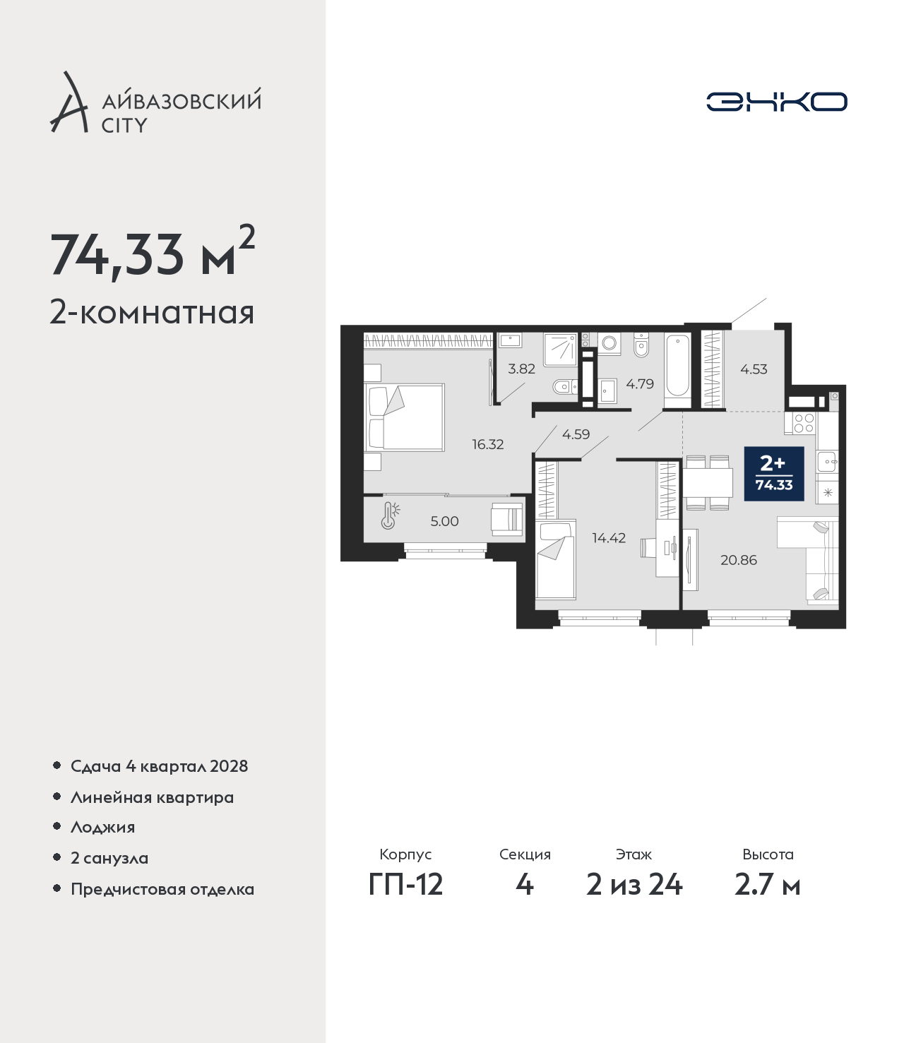 2-комн. квартира с предчистовой отделкой в ЖК "Айвазовский City" на 2 этаже. Общая площадь: 74.33 кв.м., жилая: 30.74 кв.м., площадь просторной кухни-столовой: 20.86 кв.м. Комнаты изолированные, все окна выходят на одну сторону. В квартире одна лоджия, два совмещенных санузла. Высота потолков 2.7 м. Дом монолитный, многоподъездный, высотой 24 этажа. Квартира находится в 4-й секции в корпусе ГП-12. На этаже 5 квартир. В подъезде 1 пассажирский и 1 грузовой лифт. Окончание строительства - 4 квартал 2028 года. Оформление сделки по договору долевого участия. Новый жилой район располагается в живописном месте на берегу Туры в центральной части города. Принципиально новое пространство для жизни в центре современного города для тех, чьи мечты сбываются, кто нацелен на постоянный рост, перемены к лучшему для себя и своих близких. Каждая деталь Айвазовский City вдохновляет и заряжает на новые свершения: авторская архитектура, сбалансированная продуманная инфраструктура, дизайнерские дворы со спортивными и детскими площадками, парковые зоны с фонтанами, водный канал, украшающий центральный прогулочный маршрут района и многое другое. В 2019 года проект стал лауреатом престижной премии Urban Awards 2019 в номинации «Лучший строящийся региональный жилой комплекс бизнес-класса». Главная особенность Айвазовский City - соседство разных архитектурных школ в рамках одного дома. Изысканная классика, выразительная эклектика и оригинальный модерн - жить в одном из таких домов настоящий повод для гордости. Айвазовский City это идеальное сочетание комфорта, технологий и развитой инфраструктуры. Вход в подъезд возможен с улицы и со двора. Отправляясь на работу или за покупками, жители могут выйти с внешней стороны дома, а для прогулки с ребенком – со стороны двора. Экологически чистые материалы и энергосберегающие технологии, качественное освещение общественных зон, видеонаблюдение по всей территории жилого района (в том числе в подъездах, лифтах и в подземном паркинге), закрытые дворы с доступом только для жителей Айвазовский City. Часть домов в Айвазовский City будут оснащены подземным паркингом. Востребованный в нашем климатическом поясе формат хранения автомобилей защитит собственность владельца в любое время года. Аккредитация в банках: ПАО Банк «ВТБ», ПАО «Газпромбанк», «Сбербанк России», ОАО «Альфа-Банк», ПАО Банк «ФК Открытие» и других. (AQID02525708)