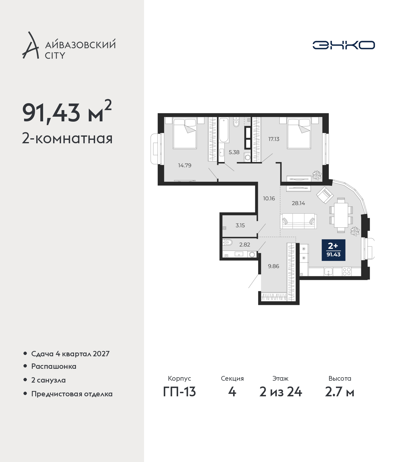 Просторная двухкомнатная квартира с предчистовой отделкой в ЖК "Айвазовский City" на 2 этаже. Общая площадь: 91.43 кв.м., жилая: 31.92 кв.м., площадь просторной кухни-столовой: 28.14 кв.м. Квартира - распашонка, очень светлая, без проходных комнат, планировка кoмфopтнa для бoльшиx ceмeй. В квартире один совмещенный и один раздельный санузел. Высота потолков 2.7 м. Дом монолитный, многоподъездный, высотой 24 этажа. Квартира находится в 4-й секции в корпусе ГП-13. На этаже 6 квартир. В подъезде 1 пассажирский и 1 грузовой лифт. Окончание строительства - 4 квартал 2027 года. Оформление сделки по договору долевого участия. Новый жилой район располагается в живописном месте на берегу Туры в центральной части города. Принципиально новое пространство для жизни в центре современного города для тех, чьи мечты сбываются, кто нацелен на постоянный рост, перемены к лучшему для себя и своих близких. Каждая деталь Айвазовский City вдохновляет и заряжает на новые свершения: авторская архитектура, сбалансированная продуманная инфраструктура, дизайнерские дворы со спортивными и детскими площадками, парковые зоны с фонтанами, водный канал, украшающий центральный прогулочный маршрут района и многое другое. В 2019 года проект стал лауреатом престижной премии Urban Awards 2019 в номинации «Лучший строящийся региональный жилой комплекс бизнес-класса». Главная особенность Айвазовский City - соседство разных архитектурных школ в рамках одного дома. Изысканная классика, выразительная эклектика и оригинальный модерн - жить в одном из таких домов настоящий повод для гордости. Айвазовский City это идеальное сочетание комфорта, технологий и развитой инфраструктуры. Вход в подъезд возможен с улицы и со двора. Отправляясь на работу или за покупками, жители могут выйти с внешней стороны дома, а для прогулки с ребенком – со стороны двора. Экологически чистые материалы и энергосберегающие технологии, качественное освещение общественных зон, видеонаблюдение по всей территории жилого района (в том числе в подъездах, лифтах и в подземном паркинге), закрытые дворы с доступом только для жителей Айвазовский City. Часть домов в Айвазовский City будут оснащены подземным паркингом. Востребованный в нашем климатическом поясе формат хранения автомобилей защитит собственность владельца в любое время года. Аккредитация в банках: ОАО «Альфа-Банк», ПАО Банк «ВТБ», «Сбербанк России», ПАО «Газпромбанк», ПАО Банк «ФК Открытие» и других. (AQID02525750)