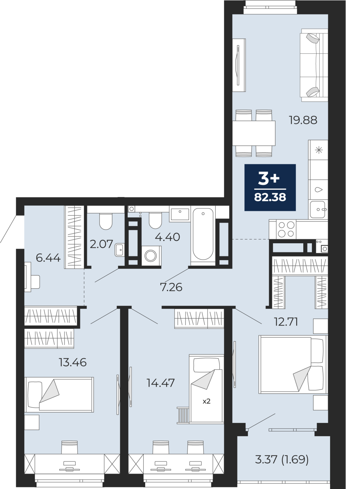 Продается трехкомнатная квартира с предчистовой отделкой в ЖК "Прео" на 7 этаже. Общая площадь: 82.38 кв.м., жилая: 40.64 кв.м., площадь просторной кухни-столовой: 19.88 кв.м. Квартира - распашонка, без проходных комнат, окна выходят на paзные стороны дома. В квартире одна лоджия, один совмещенный и один раздельный санузел. Высота потолков 2.7 м. Дом монолитный, трехподъездный, переменной этажности, от 14 до 23 этажей. Квартира находится во 2-й секции высотой 23 этажа в корпусе 206. На этаже 10 квартир. В подъезде 1 пассажирский и 1 грузовой лифт. Окончание строительства - 4 квартал 2025 года. Оформление сделки по договору долевого участия. Преображенский — один из самых привлекательных районов для жизни! Это полностью самостоятельный жилой район с точки зрения инфраструктуры. Преображенский находится между Московским и Червишевским трактами в квартале улиц Закалужская — Вьюжная — Александра Протозанова. Не нужно ждать, когда появится инфраструктура — переезжайте на всё готовое. Вблизи расположены действующие школа и детский сад. В этом году откроется еще один сад, а в следующем году — школа. По соседству с Преображенским запланировано строительство городского парка «Комарово» площадью 38 гектар. За 10 минут можно доехать на автомобиле до крупных ТРЦ: «Лента», «Кристалл», «Леруа Мерлен», «Метро» и «Ашан». С 2018 года в районе открыт Соседский центр — пространство, созданное для формирования добрососедской среды, совместного досуга, общения и реализации соседских инициатив. Здесь проходят встречи соседей, а также сами жители района организовывают мероприятия. Организатором такого события может стать любой желающий. В квартирах выполнена качественная предчистовая отделка. Гладкие стены с финишным выравниванием по маякам. Ровный потолок для установки натяжного потолка. Установлены пятикамерные окна с двойным стеклопакетом (3 стекла). Дизайнерские холлы с видеонаблюдением, безбарьерным и прозрачным входом – всегда светло и спокойно. На первом этаже есть просторные колясочные, где все жители могут оставлять свои коляски и велосипеды. В Преображенском есть всё, что нужно для активного отдыха и занятий спортом. Мы сделали большое футбольное поле с безопасным покрытием. Также установили хоккейный корт, который оборудован по всем необходимым стандартам. Во дворах можно делать упражнения на специальных площадках с турниками. Весь район мы обустроили велодорожками, которые связаны в единый маршрут. У нас есть сухие фонтаны, бьющие из земли, деревья, веревки, сетки, скалодром, газон, песок и резинка — осталось просто дать своему ребенку право на свободную игру. По-настоящему хорошие дворы — это те, которые дети предпочитают соцсетям и телевизору. Аккредитация в банках: ПАО «Банк Уралсиб», ОАО «Альфа-Банк», ПАО «Газпромбанк», ПАО Банк «ВТБ», «Сбербанк России» и других. (AQID02526674)