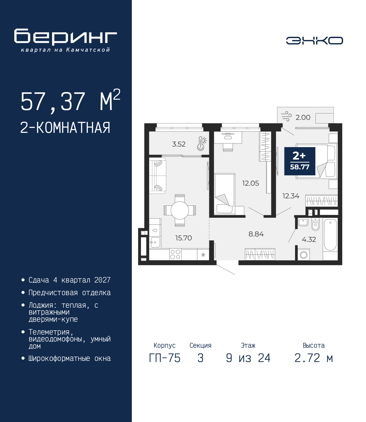 Двухкомнатная квартира от застройщика с предчистовой отделкой в ЖК "Беринг" на 9 этаже. Общая площадь: 57.37 кв.м., жилая: 24.39 кв.м., площадь просторной кухни-столовой: 15.7 кв.м. Комнаты изолированные, все окна выходят на одну сторону. В квартире один балкон и одна лоджия, один совмещенный санузел. Высота потолков 2.72 м. Дом монолитный, многоподъездный, переменной этажности, от 17 до 24 этажей. Квартира находится в 3-й секции высотой 24 этажа в корпусе ГП-75. На этаже 6 квартир. В подъезде 2 пассажирских и 1 грузовой лифт. Окончание строительства - 4 квартал 2027 года. Оформление сделки по договору долевого участия. Подобно знаменитому исследователю, мы чувствуем себя первооткрывателями этой локации. Хотим показать новую суть места, сформировать для вас жизненный опыт, которого ещё не было. Беринг — район зелёного цвета. Беринг — район, который откроется вам с другой стороны. Впечатлит новым уровнем комфорта и качеством жизни. Беринг — открытие на карте города. Первый квартал расположен в районе Тура, в границах улиц: Камчатская – Западносибирская – Энтузиастов. Вокруг уже есть всё для того, чтобы ежедневная рутина была лишь частью жизни и не доставляла дискомфорта. Школы и детские сады, магазины и аптеки, поликлиника, места для семейного отдыха, пеших и велопрогулок, и даже рыбалки. Масштабное озеленение дворов — визитная карточка ЭНКО и ваш оазис спокойствия, чтобы отвлечься от повседневности. Раскидистые деревья, кустарники, травы и цветы — осталось остановиться, вдохнуть и расслабиться, глядя на эту природную красоту. Стилистика подъездов продолжает концепцию Беринга, вдохновлённого Камчаткой: сдержанный, но при этом впечатляющий дизайн соседствует с удобством и функциональностью. (AQID02529698)