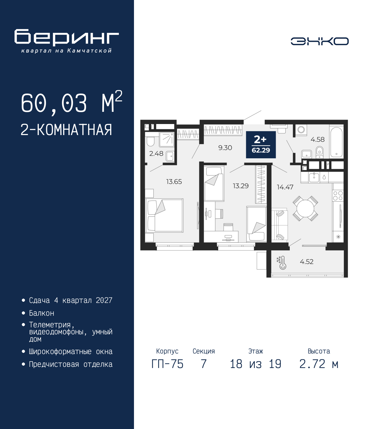 Просторная 2-комн. квартира с предчистовой отделкой в ЖК "Беринг" на 18 этаже. Общая площадь: 60.03 кв.м., жилая: 26.94 кв.м., площадь просторной кухни-столовой: 14.47 кв.м. Комнаты изолированные, все окна выходят на одну сторону. В квартире один балкон, два совмещенных санузла. Высота потолков 2.72 м. Дом монолитный, многоподъездный, переменной этажности, от 17 до 24 этажей. Квартира находится в 7-й секции высотой 19 этажей в корпусе ГП-75. На этаже 7 квартир. В подъезде 2 пассажирских и 1 грузовой лифт. Окончание строительства - 4 квартал 2027 года. Оформление сделки по договору долевого участия. Подобно знаменитому исследователю, мы чувствуем себя первооткрывателями этой локации. Хотим показать новую суть места, сформировать для вас жизненный опыт, которого ещё не было. Беринг — район зелёного цвета. Беринг — район, который откроется вам с другой стороны. Впечатлит новым уровнем комфорта и качеством жизни. Беринг — открытие на карте города. Первый квартал расположен в районе Тура, в границах улиц: Камчатская – Западносибирская – Энтузиастов. Вокруг уже есть всё для того, чтобы ежедневная рутина была лишь частью жизни и не доставляла дискомфорта. Школы и детские сады, магазины и аптеки, поликлиника, места для семейного отдыха, пеших и велопрогулок, и даже рыбалки. Масштабное озеленение дворов — визитная карточка ЭНКО и ваш оазис спокойствия, чтобы отвлечься от повседневности. Раскидистые деревья, кустарники, травы и цветы — осталось остановиться, вдохнуть и расслабиться, глядя на эту природную красоту. Стилистика подъездов продолжает концепцию Беринга, вдохновлённого Камчаткой: сдержанный, но при этом впечатляющий дизайн соседствует с удобством и функциональностью. (AQID02529733)