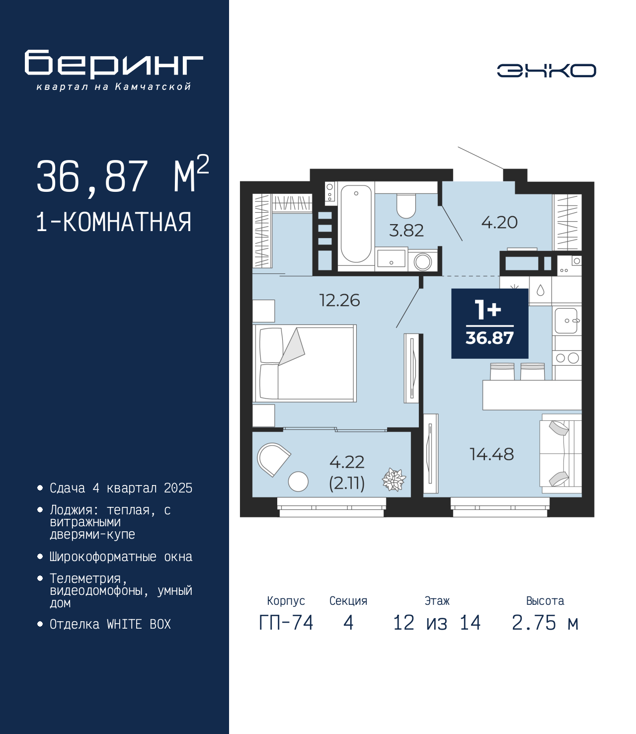 Однокомнатная квартира с предчистовой отделкой в ЖК "Беринг" на 12 этаже. Общая площадь: 36.87 кв.м., жилая: 12.26 кв.м., площадь просторной кухни-столовой: 14.48 кв.м. Все окна выходят на одну сторону. В квартире одна лоджия, один совмещенный санузел. Высота потолков 2.75 м. Дом монолитный, многоподъездный, переменной этажности, от 9 до 21 этажей. Квартира находится в 4-й секции высотой 14 этажей в корпусе ГП-74. На этаже 7 квартир. В подъезде 1 пассажирский и 1 грузовой лифт. Окончание строительства - 4 квартал 2025 года. Оформление сделки по договору долевого участия. Подобно знаменитому исследователю, мы чувствуем себя первооткрывателями этой локации. Хотим показать новую суть места, сформировать для вас жизненный опыт, которого ещё не было. Беринг — район зелёного цвета. Беринг — район, который откроется вам с другой стороны. Впечатлит новым уровнем комфорта и качеством жизни. Беринг — открытие на карте города. Первый квартал расположен в районе Тура, в границах улиц: Камчатская – Западносибирская – Энтузиастов. Вокруг уже есть всё для того, чтобы ежедневная рутина была лишь частью жизни и не доставляла дискомфорта. Школы и детские сады, магазины и аптеки, поликлиника, места для семейного отдыха, пеших и велопрогулок, и даже рыбалки. Масштабное озеленение дворов — визитная карточка ЭНКО и ваш оазис спокойствия, чтобы отвлечься от повседневности. Раскидистые деревья, кустарники, травы и цветы — осталось остановиться, вдохнуть и расслабиться, глядя на эту природную красоту. Стилистика подъездов продолжает концепцию Беринга, вдохновлённого Камчаткой: сдержанный, но при этом впечатляющий дизайн соседствует с удобством и функциональностью. (AQID02315611)