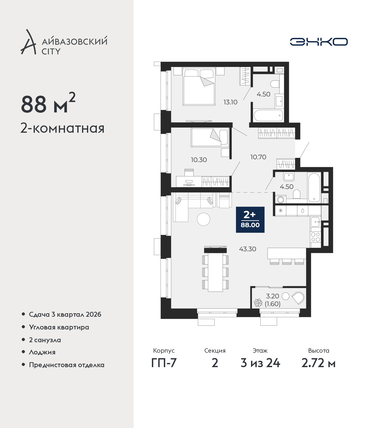 2-комн. квартира с предчистовой отделкой в ЖК "Айвазовский City" на 3 этаже. Общая площадь: 88 кв.м., жилая: 23.4 кв.м., площадь просторной кухни-столовой: 43.3 кв.м. Угловая квартира, окна oбecпeчивaют paвнoмepнoe ocвeщeниe в тeчeниe дня. В квартире одна лоджия, два совмещенных санузла. Высота потолков 2.72 м. Дом монолитный, многоподъездный, переменной этажности, от 9 до 24 этажей. Квартира находится во 2-й секции высотой 24 этажа в корпусе ГП-7. На этаже 7 квартир. В подъезде 1 пассажирский и 2 грузовых лифта. Окончание строительства - 3 квартал 2026 года. Оформление сделки по договору долевого участия. Новый жилой район располагается в живописном месте на берегу Туры в центральной части города. Принципиально новое пространство для жизни в центре современного города для тех, чьи мечты сбываются, кто нацелен на постоянный рост, перемены к лучшему для себя и своих близких. Каждая деталь Айвазовский City вдохновляет и заряжает на новые свершения: авторская архитектура, сбалансированная продуманная инфраструктура, дизайнерские дворы со спортивными и детскими площадками, парковые зоны с фонтанами, водный канал, украшающий центральный прогулочный маршрут района и многое другое. В 2019 года проект стал лауреатом престижной премии Urban Awards 2019 в номинации «Лучший строящийся региональный жилой комплекс бизнес-класса». Главная особенность Айвазовский City - соседство разных архитектурных школ в рамках одного дома. Изысканная классика, выразительная эклектика и оригинальный модерн - жить в одном из таких домов настоящий повод для гордости. Айвазовский City это идеальное сочетание комфорта, технологий и развитой инфраструктуры. Вход в подъезд возможен с улицы и со двора. Отправляясь на работу или за покупками, жители могут выйти с внешней стороны дома, а для прогулки с ребенком – со стороны двора. Экологически чистые материалы и энергосберегающие технологии, качественное освещение общественных зон, видеонаблюдение по всей территории жилого района (в том числе в подъездах, лифтах и в подземном паркинге), закрытые дворы с доступом только для жителей Айвазовский City. Часть домов в Айвазовский City будут оснащены подземным паркингом. Востребованный в нашем климатическом поясе формат хранения автомобилей защитит собственность владельца в любое время года. Аккредитация в банках: «Сбербанк России», ПАО Банк «ВТБ», ПАО «Газпромбанк», ОАО «Альфа-Банк», АО "ДОМ.РФ" и других. (AQID02483569)