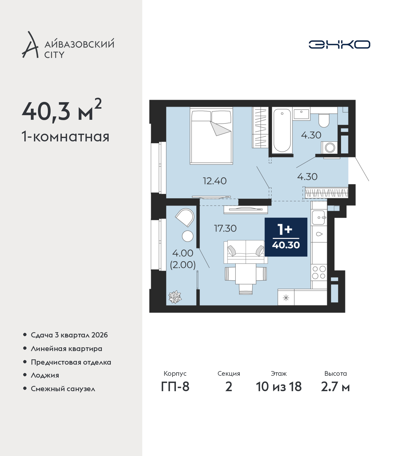 Продается однокомнатная квартира с предчистовой отделкой в ЖК "Айвазовский City" на 10 этаже. Общая площадь: 40.3 кв.м., жилая: 12.4 кв.м., площадь просторной кухни-столовой: 17.3 кв.м. Все окна выходят на одну сторону. В квартире одна лоджия, один совмещенный санузел. Высота потолков 2.7 м. Дом монолитный, многоподъездный, переменной этажности, от 14 до 24 этажей. Квартира находится во 2-й секции высотой 18 этажей в корпусе ГП-8. На этаже 5 квартир. В подъезде 1 пассажирский и 1 грузовой лифт. Окончание строительства - 3 квартал 2026 года. Оформление сделки по договору долевого участия. Новый жилой район располагается в живописном месте на берегу Туры в центральной части города. Принципиально новое пространство для жизни в центре современного города для тех, чьи мечты сбываются, кто нацелен на постоянный рост, перемены к лучшему для себя и своих близких. Каждая деталь Айвазовский City вдохновляет и заряжает на новые свершения: авторская архитектура, сбалансированная продуманная инфраструктура, дизайнерские дворы со спортивными и детскими площадками, парковые зоны с фонтанами, водный канал, украшающий центральный прогулочный маршрут района и многое другое. В 2019 года проект стал лауреатом престижной премии Urban Awards 2019 в номинации «Лучший строящийся региональный жилой комплекс бизнес-класса». Главная особенность Айвазовский City - соседство разных архитектурных школ в рамках одного дома. Изысканная классика, выразительная эклектика и оригинальный модерн - жить в одном из таких домов настоящий повод для гордости. Айвазовский City это идеальное сочетание комфорта, технологий и развитой инфраструктуры. Вход в подъезд возможен с улицы и со двора. Отправляясь на работу или за покупками, жители могут выйти с внешней стороны дома, а для прогулки с ребенком – со стороны двора. Экологически чистые материалы и энергосберегающие технологии, качественное освещение общественных зон, видеонаблюдение по всей территории жилого района (в том числе в подъездах, лифтах и в подземном паркинге), закрытые дворы с доступом только для жителей Айвазовский City. Часть домов в Айвазовский City будут оснащены подземным паркингом. Востребованный в нашем климатическом поясе формат хранения автомобилей защитит собственность владельца в любое время года. Аккредитация в банках: ПАО Банк «ВТБ», ПАО «Газпромбанк», «Сбербанк России», ОАО «Альфа-Банк», ПАО «Промсвязьбанк» и других. (AQID02483730)