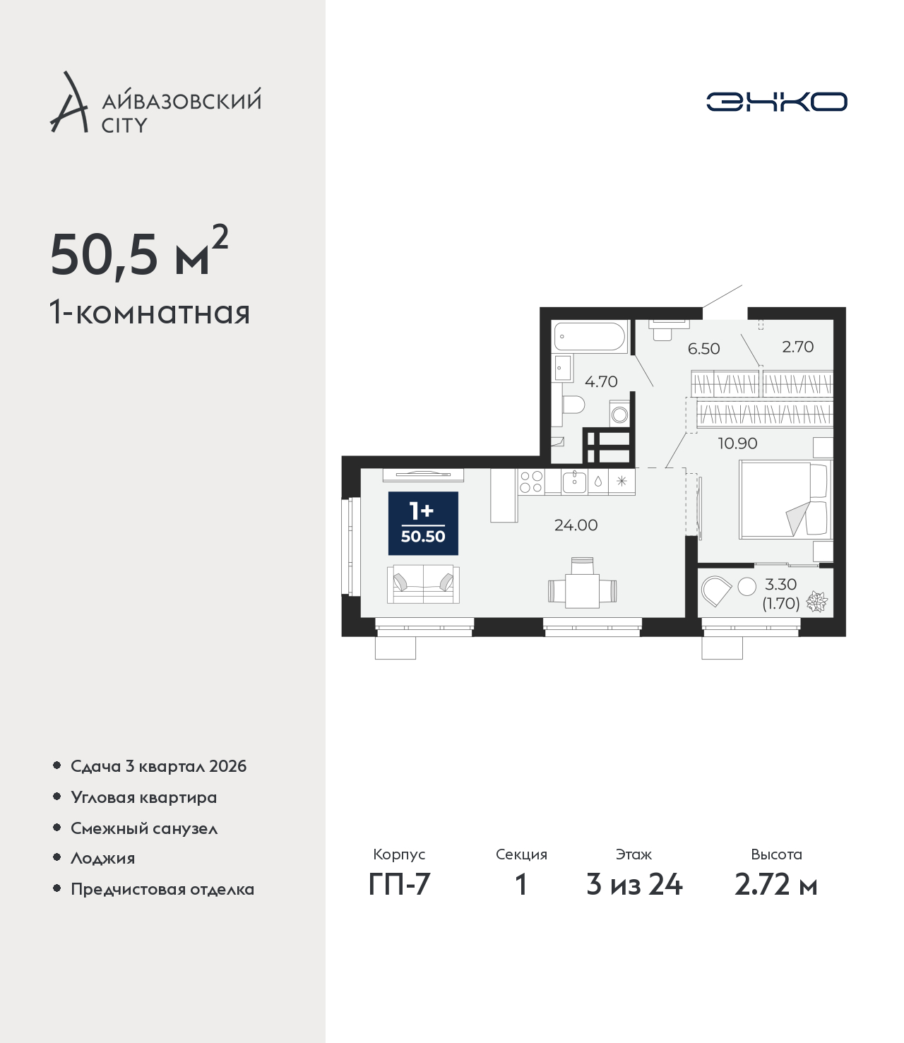 Просторная 1-комн. квартира с предчистовой отделкой в ЖК "Айвазовский City" на 3 этаже. Общая площадь: 50.5 кв.м., жилая: 10.9 кв.м., площадь просторной кухни-столовой: 24 кв.м. Квартира угловая, очень светлая, естественная вентиляция при открытии окон. В квартире одна лоджия, один совмещенный санузел. Высота потолков 2.72 м. Дом монолитный, многоподъездный, переменной этажности, от 9 до 24 этажей. Квартира находится в 1-й секции высотой 24 этажа в корпусе ГП-7. На этаже 6 квартир. В подъезде 1 пассажирский и 2 грузовых лифта. Окончание строительства - 3 квартал 2026 года. Оформление сделки по договору долевого участия. Новый жилой район располагается в живописном месте на берегу Туры в центральной части города. Принципиально новое пространство для жизни в центре современного города для тех, чьи мечты сбываются, кто нацелен на постоянный рост, перемены к лучшему для себя и своих близких. Каждая деталь Айвазовский City вдохновляет и заряжает на новые свершения: авторская архитектура, сбалансированная продуманная инфраструктура, дизайнерские дворы со спортивными и детскими площадками, парковые зоны с фонтанами, водный канал, украшающий центральный прогулочный маршрут района и многое другое. В 2019 года проект стал лауреатом престижной премии Urban Awards 2019 в номинации «Лучший строящийся региональный жилой комплекс бизнес-класса». Главная особенность Айвазовский City - соседство разных архитектурных школ в рамках одного дома. Изысканная классика, выразительная эклектика и оригинальный модерн - жить в одном из таких домов настоящий повод для гордости. Айвазовский City это идеальное сочетание комфорта, технологий и развитой инфраструктуры. Вход в подъезд возможен с улицы и со двора. Отправляясь на работу или за покупками, жители могут выйти с внешней стороны дома, а для прогулки с ребенком – со стороны двора. Экологически чистые материалы и энергосберегающие технологии, качественное освещение общественных зон, видеонаблюдение по всей территории жилого района (в том числе в подъездах, лифтах и в подземном паркинге), закрытые дворы с доступом только для жителей Айвазовский City. Часть домов в Айвазовский City будут оснащены подземным паркингом. Востребованный в нашем климатическом поясе формат хранения автомобилей защитит собственность владельца в любое время года. Аккредитация в банках: ПАО «Газпромбанк», ПАО Банк «ВТБ», ОАО «Альфа-Банк», «Сбербанк России», ПАО Банк «ФК Открытие» и других. (AQID02487888)