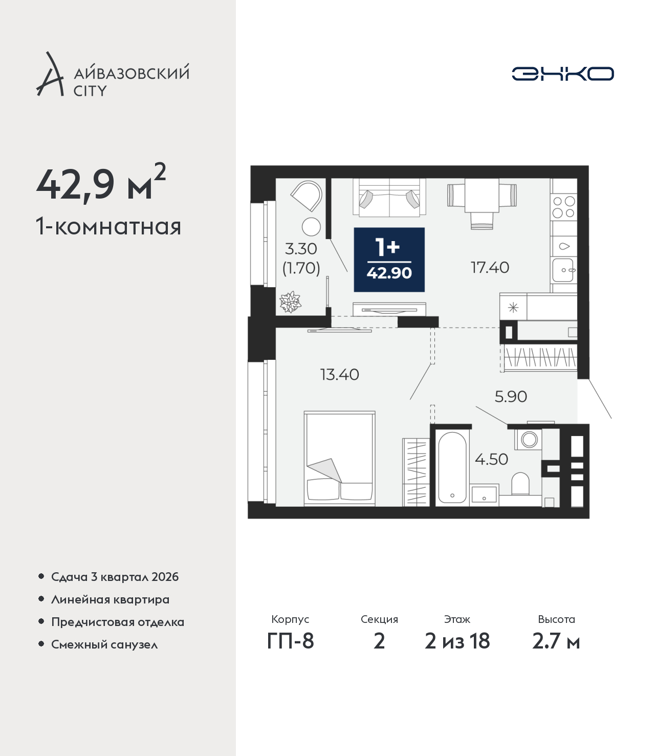 Продается 1-комн. квартира с предчистовой отделкой в ЖК "Айвазовский City" на 2 этаже. Общая площадь: 42.9 кв.м., жилая: 12.5 кв.м., площадь просторной кухни-столовой: 21.8 кв.м. Все окна выходят на одну сторону. В квартире один совмещенный санузел. Высота потолков 2.7 м. Дом монолитный, многоподъездный, переменной этажности, от 14 до 24 этажей. Квартира находится во 2-й секции высотой 18 этажей в корпусе ГП-8. На этаже 5 квартир. В подъезде 1 пассажирский и 1 грузовой лифт. Окончание строительства - 3 квартал 2026 года. Оформление сделки по договору долевого участия. Новый жилой район располагается в живописном месте на берегу Туры в центральной части города. Принципиально новое пространство для жизни в центре современного города для тех, чьи мечты сбываются, кто нацелен на постоянный рост, перемены к лучшему для себя и своих близких. Каждая деталь Айвазовский City вдохновляет и заряжает на новые свершения: авторская архитектура, сбалансированная продуманная инфраструктура, дизайнерские дворы со спортивными и детскими площадками, парковые зоны с фонтанами, водный канал, украшающий центральный прогулочный маршрут района и многое другое. В 2019 года проект стал лауреатом престижной премии Urban Awards 2019 в номинации «Лучший строящийся региональный жилой комплекс бизнес-класса». Главная особенность Айвазовский City - соседство разных архитектурных школ в рамках одного дома. Изысканная классика, выразительная эклектика и оригинальный модерн - жить в одном из таких домов настоящий повод для гордости. Айвазовский City это идеальное сочетание комфорта, технологий и развитой инфраструктуры. Вход в подъезд возможен с улицы и со двора. Отправляясь на работу или за покупками, жители могут выйти с внешней стороны дома, а для прогулки с ребенком – со стороны двора. Экологически чистые материалы и энергосберегающие технологии, качественное освещение общественных зон, видеонаблюдение по всей территории жилого района (в том числе в подъездах, лифтах и в подземном паркинге), закрытые дворы с доступом только для жителей Айвазовский City. Часть домов в Айвазовский City будут оснащены подземным паркингом. Востребованный в нашем климатическом поясе формат хранения автомобилей защитит собственность владельца в любое время года. Аккредитация в банках: ОАО «Альфа-Банк», «Сбербанк России», ПАО «Газпромбанк», ПАО Банк «ВТБ», ПАО Банк «ФК Открытие» и других. (AQID02488014)