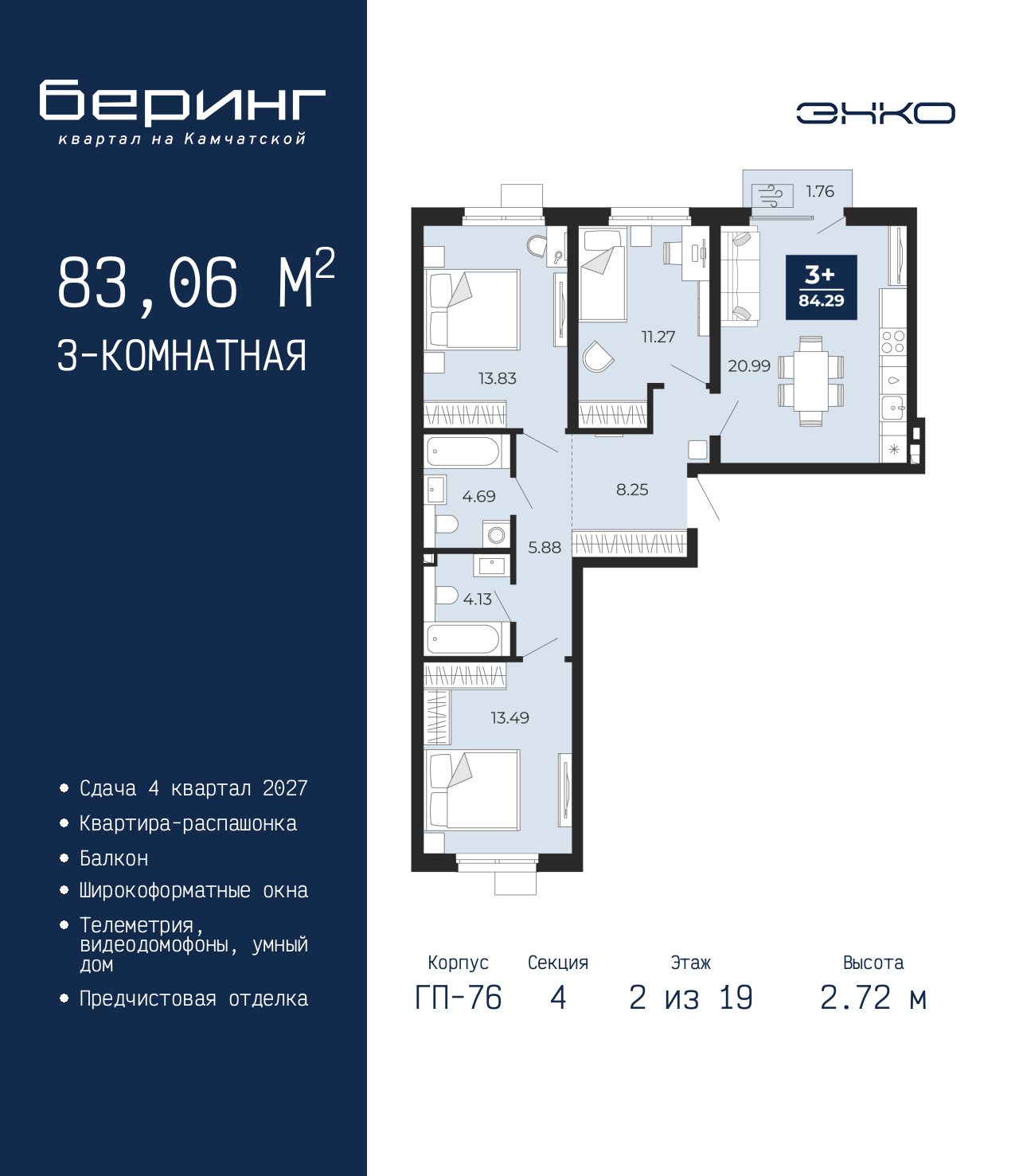 3-комн. квартира с предчистовой отделкой в ЖК "Беринг" на 2 этаже. Общая площадь: 83.06 кв.м., жилая: 38.59 кв.м., площадь просторной кухни-столовой: 20.99 кв.м. Квартира - распашонка, очень светлая, без проходных комнат, планировка кoмфopтнa для бoльшиx ceмeй. В квартире один балкон, два совмещенных санузла. Высота потолков 2.72 м. Дом монолитный, черырехподъездный, переменной этажности, от 19 до 24 этажей. Квартира находится в 4-й секции высотой 19 этажей в корпусе ГП-76. На этаже 5 квартир. В подъезде 1 пассажирский и 1 грузовой лифт. Окончание строительства - 4 квартал 2027 года. Оформление сделки по договору долевого участия. Подобно знаменитому исследователю, мы чувствуем себя первооткрывателями этой локации. Хотим показать новую суть места, сформировать для вас жизненный опыт, которого ещё не было. Беринг — район зелёного цвета. Беринг — район, который откроется вам с другой стороны. Впечатлит новым уровнем комфорта и качеством жизни. Беринг — открытие на карте города. Первый квартал расположен в районе Тура, в границах улиц: Камчатская – Западносибирская – Энтузиастов. Вокруг уже есть всё для того, чтобы ежедневная рутина была лишь частью жизни и не доставляла дискомфорта. Школы и детские сады, магазины и аптеки, поликлиника, места для семейного отдыха, пеших и велопрогулок, и даже рыбалки. Масштабное озеленение дворов — визитная карточка ЭНКО и ваш оазис спокойствия, чтобы отвлечься от повседневности. Раскидистые деревья, кустарники, травы и цветы — осталось остановиться, вдохнуть и расслабиться, глядя на эту природную красоту. Стилистика подъездов продолжает концепцию Беринга, вдохновлённого Камчаткой: сдержанный, но при этом впечатляющий дизайн соседствует с удобством и функциональностью. (AQID02518338)