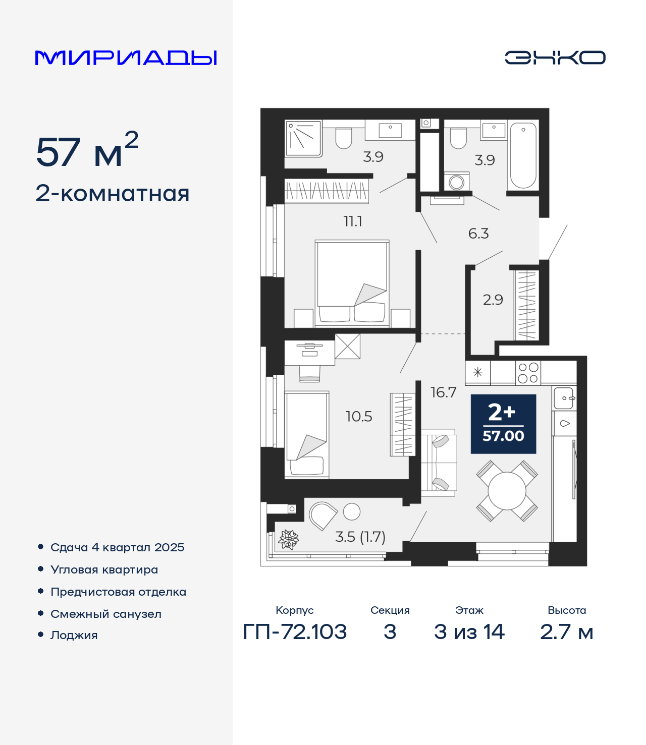 - Общая площадь 57 м²