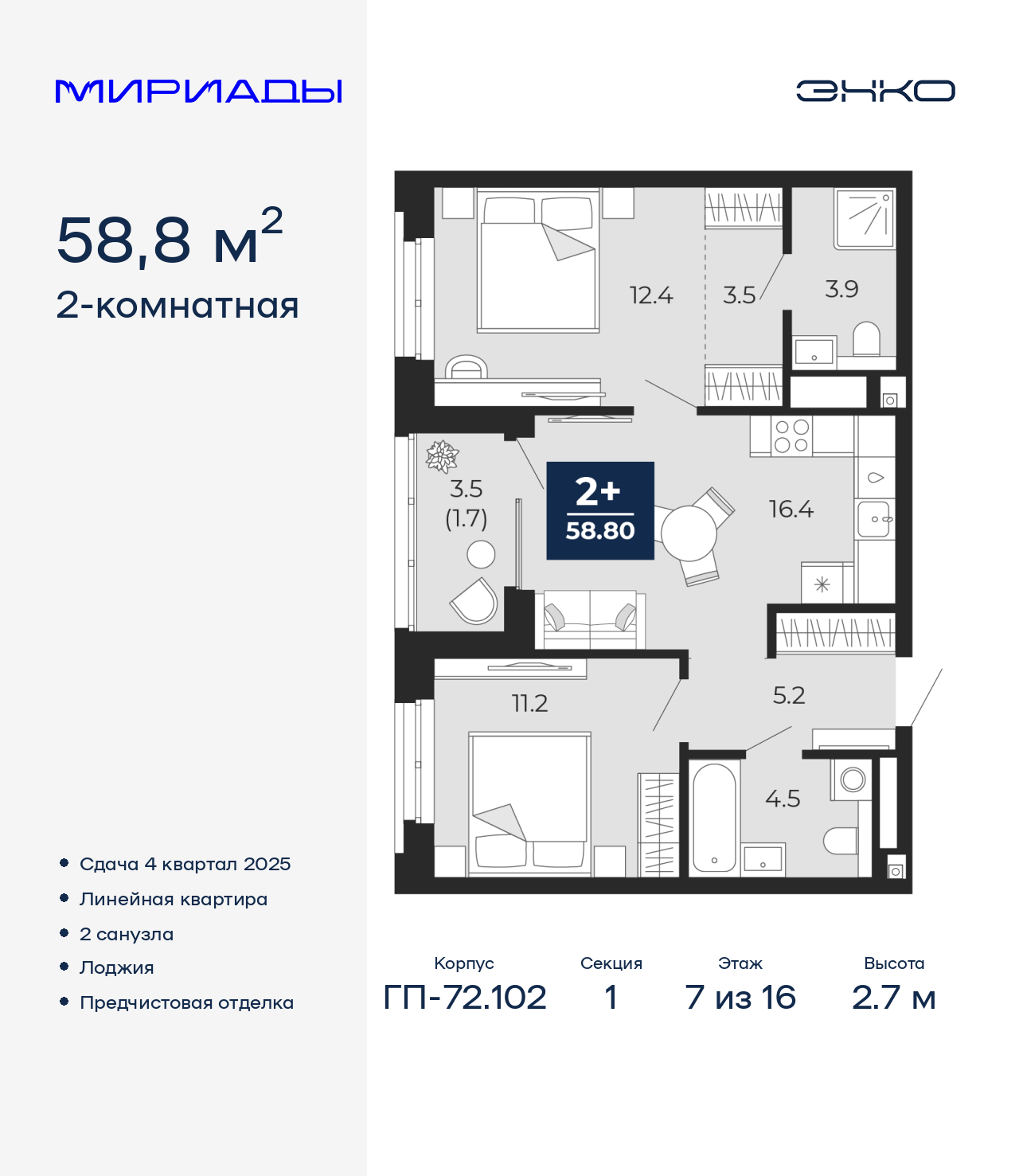 - Общая площадь 58.8 м²