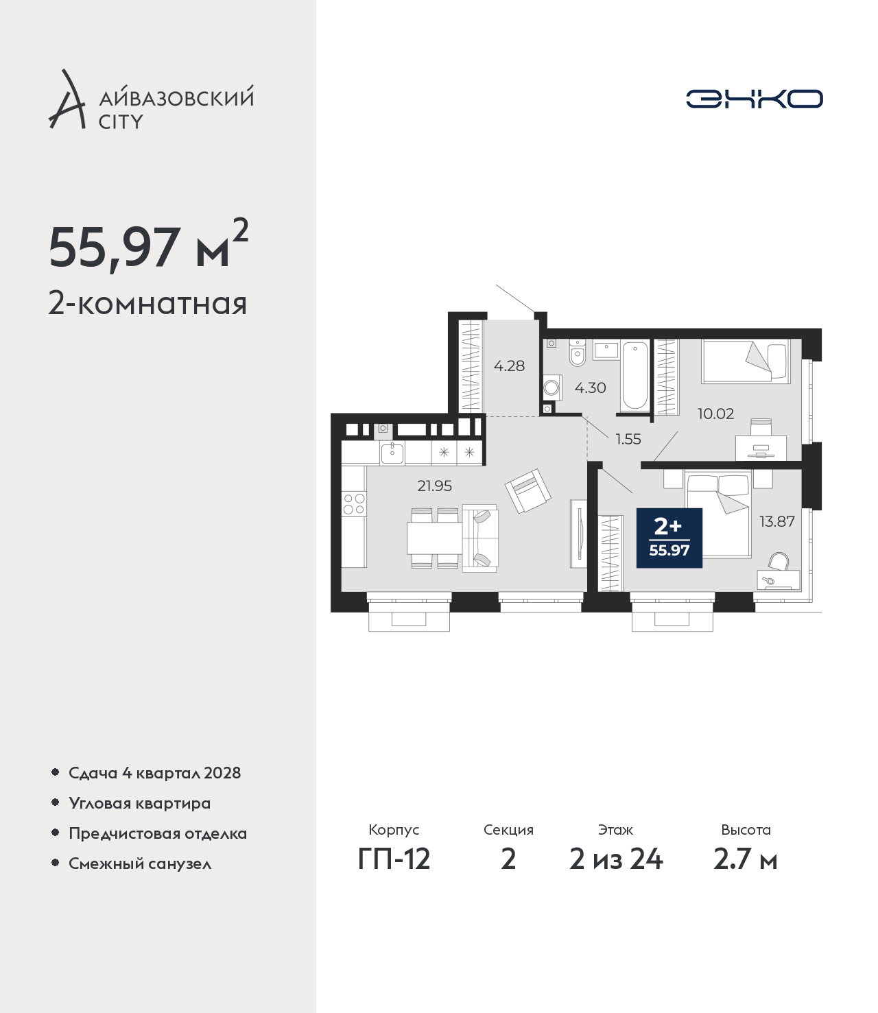 2-комн. квартира с предчистовой отделкой в ЖК "Айвазовский City" на 2 этаже. Общая площадь: 55.97 кв.м., жилая: 23.89 кв.м., площадь просторной кухни-столовой: 21.95 кв.м. Квартира угловая, очень светлая, естественная вентиляция при открытии окон. В квартире один совмещенный санузел. Высота потолков 2.7 м. Дом монолитный, многоподъездный, высотой 24 этажа. Квартира находится во 2-й секции в корпусе ГП-12. На этаже 6 квартир. В подъезде 1 пассажирский и 1 грузовой лифт. Окончание строительства - 4 квартал 2028 года. Оформление сделки по договору долевого участия. Новый жилой район располагается в живописном месте на берегу Туры в центральной части города. Принципиально новое пространство для жизни в центре современного города для тех, чьи мечты сбываются, кто нацелен на постоянный рост, перемены к лучшему для себя и своих близких. Каждая деталь Айвазовский City вдохновляет и заряжает на новые свершения: авторская архитектура, сбалансированная продуманная инфраструктура, дизайнерские дворы со спортивными и детскими площадками, парковые зоны с фонтанами, водный канал, украшающий центральный прогулочный маршрут района и многое другое. В 2019 года проект стал лауреатом престижной премии Urban Awards 2019 в номинации «Лучший строящийся региональный жилой комплекс бизнес-класса». Главная особенность Айвазовский City - соседство разных архитектурных школ в рамках одного дома. Изысканная классика, выразительная эклектика и оригинальный модерн - жить в одном из таких домов настоящий повод для гордости. Айвазовский City это идеальное сочетание комфорта, технологий и развитой инфраструктуры. Вход в подъезд возможен с улицы и со двора. Отправляясь на работу или за покупками, жители могут выйти с внешней стороны дома, а для прогулки с ребенком – со стороны двора. Экологически чистые материалы и энергосберегающие технологии, качественное освещение общественных зон, видеонаблюдение по всей территории жилого района (в том числе в подъездах, лифтах и в подземном паркинге), закрытые дворы с доступом только для жителей Айвазовский City. Часть домов в Айвазовский City будут оснащены подземным паркингом. Востребованный в нашем климатическом поясе формат хранения автомобилей защитит собственность владельца в любое время года. Аккредитация в банках: ОАО «Альфа-Банк», «Сбербанк России», ПАО «Газпромбанк», ПАО Банк «ВТБ», ПАО «Промсвязьбанк» и других. (AQID02525653)