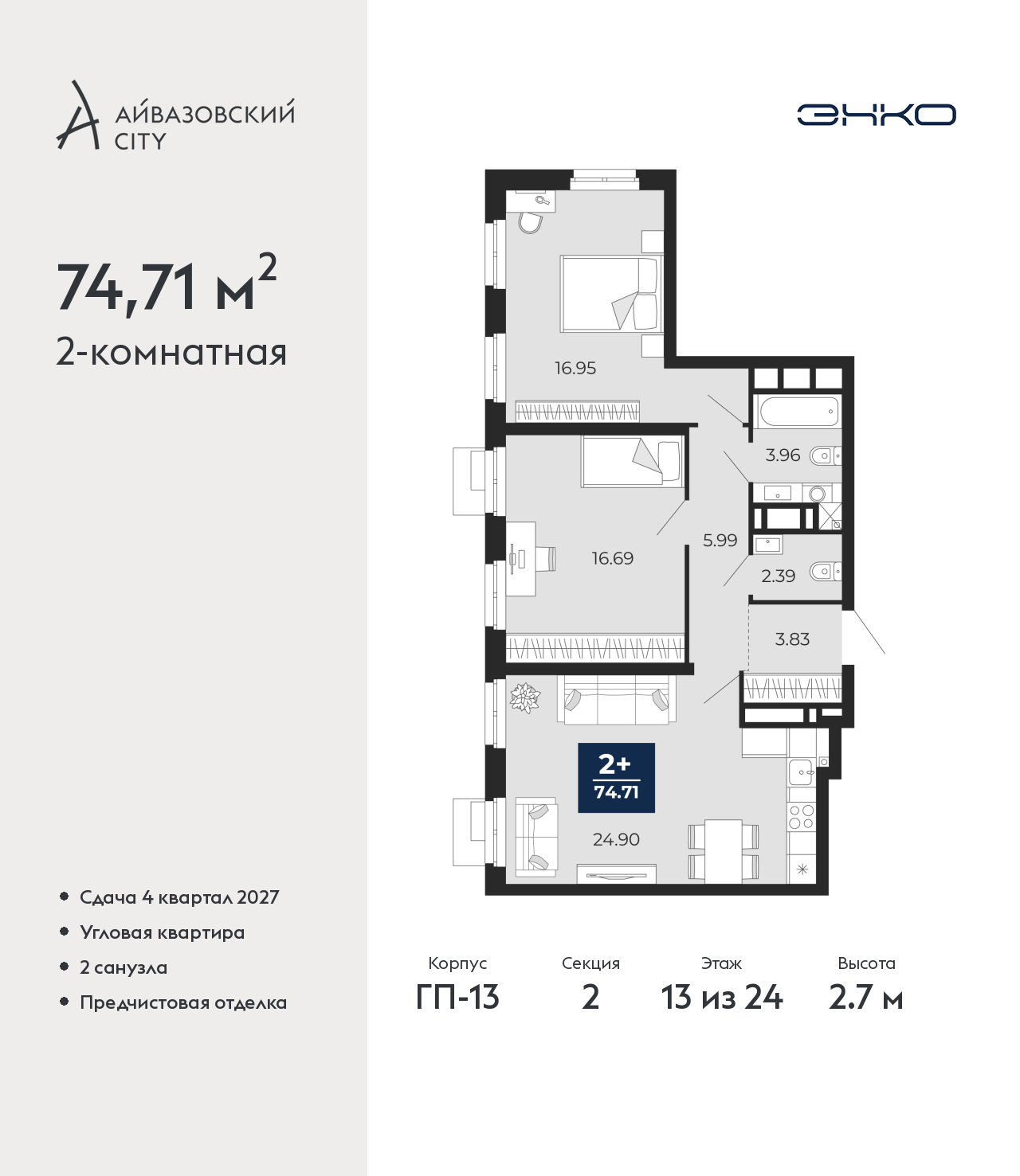 2-комн. квартира с предчистовой отделкой в ЖК "Айвазовский City" на 13 этаже. Общая площадь: 74.71 кв.м., жилая: 33.64 кв.м., площадь просторной кухни-столовой: 24.9 кв.м. Угловая квартира, идеально подойдет любителям тишины и панорамных видов. В квартире один совмещенный и один раздельный санузел. Высота потолков 2.7 м. Дом монолитный, многоподъездный, высотой 24 этажа. Квартира находится во 2-й секции в корпусе ГП-13. На этаже 6 квартир. В подъезде 1 пассажирский и 1 грузовой лифт. Окончание строительства - 4 квартал 2027 года. Оформление сделки по договору долевого участия. Новый жилой район располагается в живописном месте на берегу Туры в центральной части города. Принципиально новое пространство для жизни в центре современного города для тех, чьи мечты сбываются, кто нацелен на постоянный рост, перемены к лучшему для себя и своих близких. Каждая деталь Айвазовский City вдохновляет и заряжает на новые свершения: авторская архитектура, сбалансированная продуманная инфраструктура, дизайнерские дворы со спортивными и детскими площадками, парковые зоны с фонтанами, водный канал, украшающий центральный прогулочный маршрут района и многое другое. В 2019 года проект стал лауреатом престижной премии Urban Awards 2019 в номинации «Лучший строящийся региональный жилой комплекс бизнес-класса». Главная особенность Айвазовский City - соседство разных архитектурных школ в рамках одного дома. Изысканная классика, выразительная эклектика и оригинальный модерн - жить в одном из таких домов настоящий повод для гордости. Айвазовский City это идеальное сочетание комфорта, технологий и развитой инфраструктуры. Вход в подъезд возможен с улицы и со двора. Отправляясь на работу или за покупками, жители могут выйти с внешней стороны дома, а для прогулки с ребенком – со стороны двора. Экологически чистые материалы и энергосберегающие технологии, качественное освещение общественных зон, видеонаблюдение по всей территории жилого района (в том числе в подъездах, лифтах и в подземном паркинге), закрытые дворы с доступом только для жителей Айвазовский City. Часть домов в Айвазовский City будут оснащены подземным паркингом. Востребованный в нашем климатическом поясе формат хранения автомобилей защитит собственность владельца в любое время года. Аккредитация в банках: ОАО «Альфа-Банк», «Сбербанк России», ПАО Банк «ВТБ», ПАО «Газпромбанк», ПАО «Совкомбанк» и других. (AQID02525730)