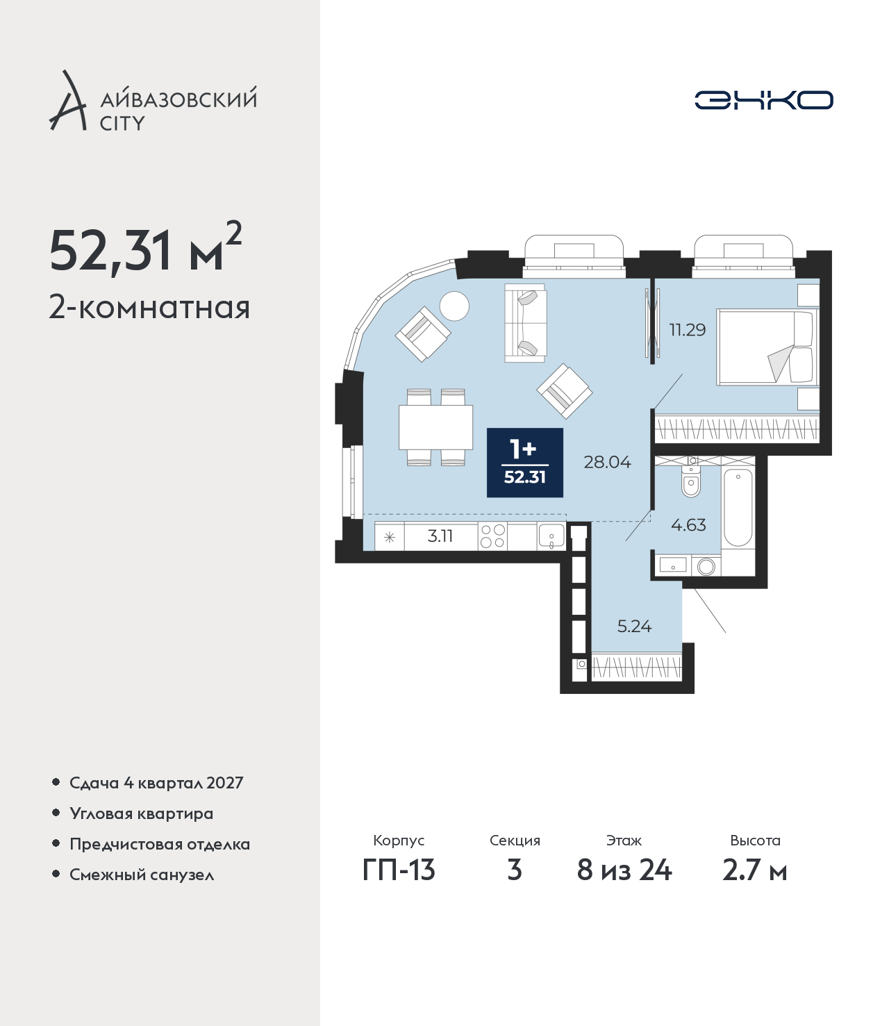 Двухкомнатная квартира с европланировкой и предчистовой отделкой в ЖК "Айвазовский City" на 8 этаже. Общая площадь: 52.31 кв.м., жилая: 39.33 кв.м., суммарная площадь гостиной-столовой с кухонной зоной: 31.15 кв.м. Европейская планировка, зона гостиной комнаты объединена с кухней. Угловая квартира, очень светлая, естественная вентиляция при открытии окон. В квартире один совмещенный санузел. Высота потолков 2.7 м. Дом монолитный, многоподъездный, высотой 24 этажа. Квартира находится в 3-й секции в корпусе ГП-13. На этаже 9 квартир. В подъезде 1 пассажирский и 1 грузовой лифт. Окончание строительства - 4 квартал 2027 года. Оформление сделки по договору долевого участия. Новый жилой район располагается в живописном месте на берегу Туры в центральной части города. Принципиально новое пространство для жизни в центре современного города для тех, чьи мечты сбываются, кто нацелен на постоянный рост, перемены к лучшему для себя и своих близких. Каждая деталь Айвазовский City вдохновляет и заряжает на новые свершения: авторская архитектура, сбалансированная продуманная инфраструктура, дизайнерские дворы со спортивными и детскими площадками, парковые зоны с фонтанами, водный канал, украшающий центральный прогулочный маршрут района и многое другое. В 2019 года проект стал лауреатом престижной премии Urban Awards 2019 в номинации «Лучший строящийся региональный жилой комплекс бизнес-класса». Главная особенность Айвазовский City - соседство разных архитектурных школ в рамках одного дома. Изысканная классика, выразительная эклектика и оригинальный модерн - жить в одном из таких домов настоящий повод для гордости. Айвазовский City это идеальное сочетание комфорта, технологий и развитой инфраструктуры. Вход в подъезд возможен с улицы и со двора. Отправляясь на работу или за покупками, жители могут выйти с внешней стороны дома, а для прогулки с ребенком – со стороны двора. Экологически чистые материалы и энергосберегающие технологии, качественное освещение общественных зон, видеонаблюдение по всей территории жилого района (в том числе в подъездах, лифтах и в подземном паркинге), закрытые дворы с доступом только для жителей Айвазовский City. Часть домов в Айвазовский City будут оснащены подземным паркингом. Востребованный в нашем климатическом поясе формат хранения автомобилей защитит собственность владельца в любое время года. Аккредитация в банках: «Сбербанк России», ПАО Банк «ВТБ», ПАО «Газпромбанк», ОАО «Альфа-Банк», АО "ДОМ.РФ" и других. (AQID02526514)