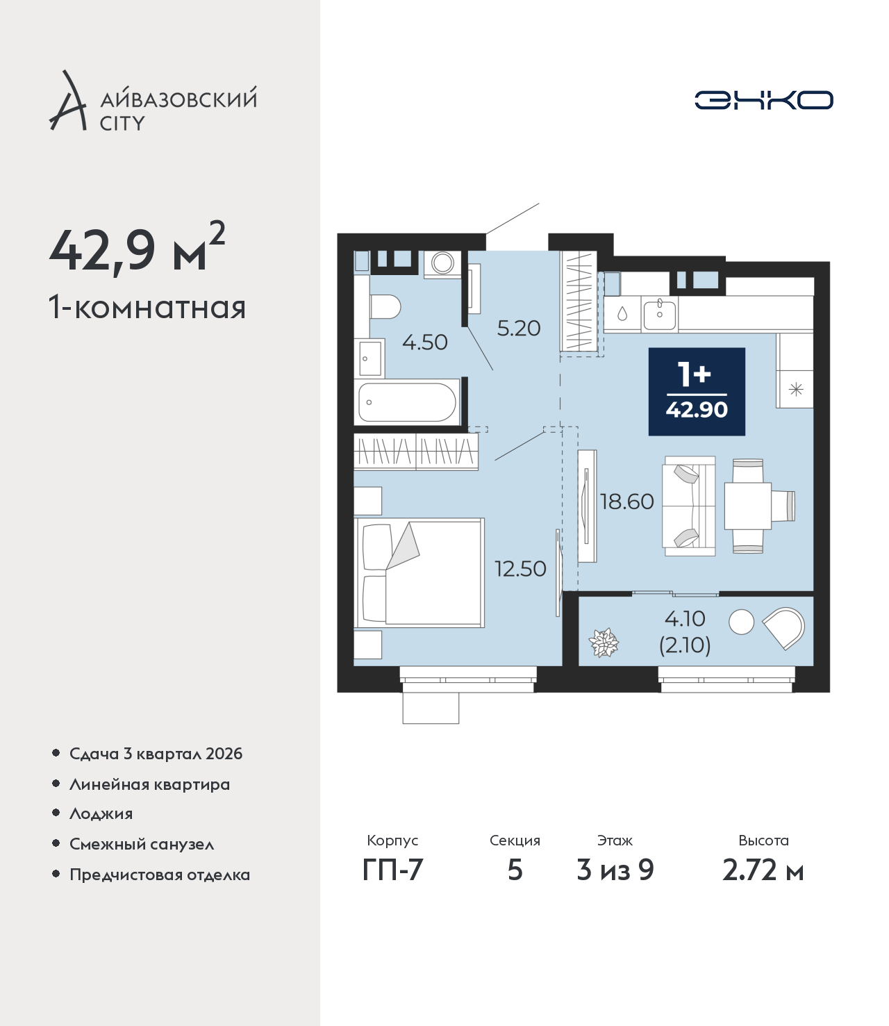 1-комн. квартира от застройщика с предчистовой отделкой в ЖК "Айвазовский City" на 3 этаже. Общая площадь: 42.9 кв.м., жилая: 12.5 кв.м., площадь просторной кухни-столовой: 18.6 кв.м. Все окна выходят на одну сторону. В квартире одна лоджия, один совмещенный санузел. Высота потолков 2.72 м. Дом монолитный, многоподъездный, переменной этажности, от 9 до 24 этажей. Квартира находится в 5-й секции высотой 9 этажей в корпусе ГП-7. На этаже 7 квартир. В подъезде 1 пассажирский и 2 грузовых лифта. Окончание строительства - 3 квартал 2026 года. Оформление сделки по договору долевого участия. Новый жилой район располагается в живописном месте на берегу Туры в центральной части города. Принципиально новое пространство для жизни в центре современного города для тех, чьи мечты сбываются, кто нацелен на постоянный рост, перемены к лучшему для себя и своих близких. Каждая деталь Айвазовский City вдохновляет и заряжает на новые свершения: авторская архитектура, сбалансированная продуманная инфраструктура, дизайнерские дворы со спортивными и детскими площадками, парковые зоны с фонтанами, водный канал, украшающий центральный прогулочный маршрут района и многое другое. В 2019 года проект стал лауреатом престижной премии Urban Awards 2019 в номинации «Лучший строящийся региональный жилой комплекс бизнес-класса». Главная особенность Айвазовский City - соседство разных архитектурных школ в рамках одного дома. Изысканная классика, выразительная эклектика и оригинальный модерн - жить в одном из таких домов настоящий повод для гордости. Айвазовский City это идеальное сочетание комфорта, технологий и развитой инфраструктуры. Вход в подъезд возможен с улицы и со двора. Отправляясь на работу или за покупками, жители могут выйти с внешней стороны дома, а для прогулки с ребенком – со стороны двора. Экологически чистые материалы и энергосберегающие технологии, качественное освещение общественных зон, видеонаблюдение по всей территории жилого района (в том числе в подъездах, лифтах и в подземном паркинге), закрытые дворы с доступом только для жителей Айвазовский City. Часть домов в Айвазовский City будут оснащены подземным паркингом. Востребованный в нашем климатическом поясе формат хранения автомобилей защитит собственность владельца в любое время года. Аккредитация в банках: ПАО «Газпромбанк», ОАО «Альфа-Банк», «Сбербанк России», ПАО Банк «ВТБ», ПАО «Промсвязьбанк» и других. (AQID02343185)