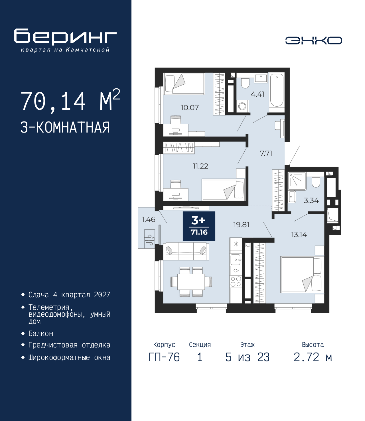 Трехкомнатная квартира с предчистовой отделкой в ЖК "Беринг" на 5 этаже. Общая площадь: 70.14 кв.м., жилая: 34.43 кв.м., площадь просторной кухни-столовой: 19.81 кв.м. Угловая квартира, очень светлая, естественная вентиляция при открытии окон. В квартире один балкон, два совмещенных санузла. Высота потолков 2.72 м. Дом монолитный, черырехподъездный, переменной этажности, от 19 до 24 этажей. Квартира находится в 1-й секции высотой 23 этажа в корпусе ГП-76. На этаже 7 квартир. В подъезде 2 пассажирских и 1 грузовой лифт. Окончание строительства - 4 квартал 2027 года. Оформление сделки по договору долевого участия. Подобно знаменитому исследователю, мы чувствуем себя первооткрывателями этой локации. Хотим показать новую суть места, сформировать для вас жизненный опыт, которого ещё не было. Беринг — район зелёного цвета. Беринг — район, который откроется вам с другой стороны. Впечатлит новым уровнем комфорта и качеством жизни. Беринг — открытие на карте города. Первый квартал расположен в районе Тура, в границах улиц: Камчатская – Западносибирская – Энтузиастов. Вокруг уже есть всё для того, чтобы ежедневная рутина была лишь частью жизни и не доставляла дискомфорта. Школы и детские сады, магазины и аптеки, поликлиника, места для семейного отдыха, пеших и велопрогулок, и даже рыбалки. Масштабное озеленение дворов — визитная карточка ЭНКО и ваш оазис спокойствия, чтобы отвлечься от повседневности. Раскидистые деревья, кустарники, травы и цветы — осталось остановиться, вдохнуть и расслабиться, глядя на эту природную красоту. Стилистика подъездов продолжает концепцию Беринга, вдохновлённого Камчаткой: сдержанный, но при этом впечатляющий дизайн соседствует с удобством и функциональностью. (AQID02517954)