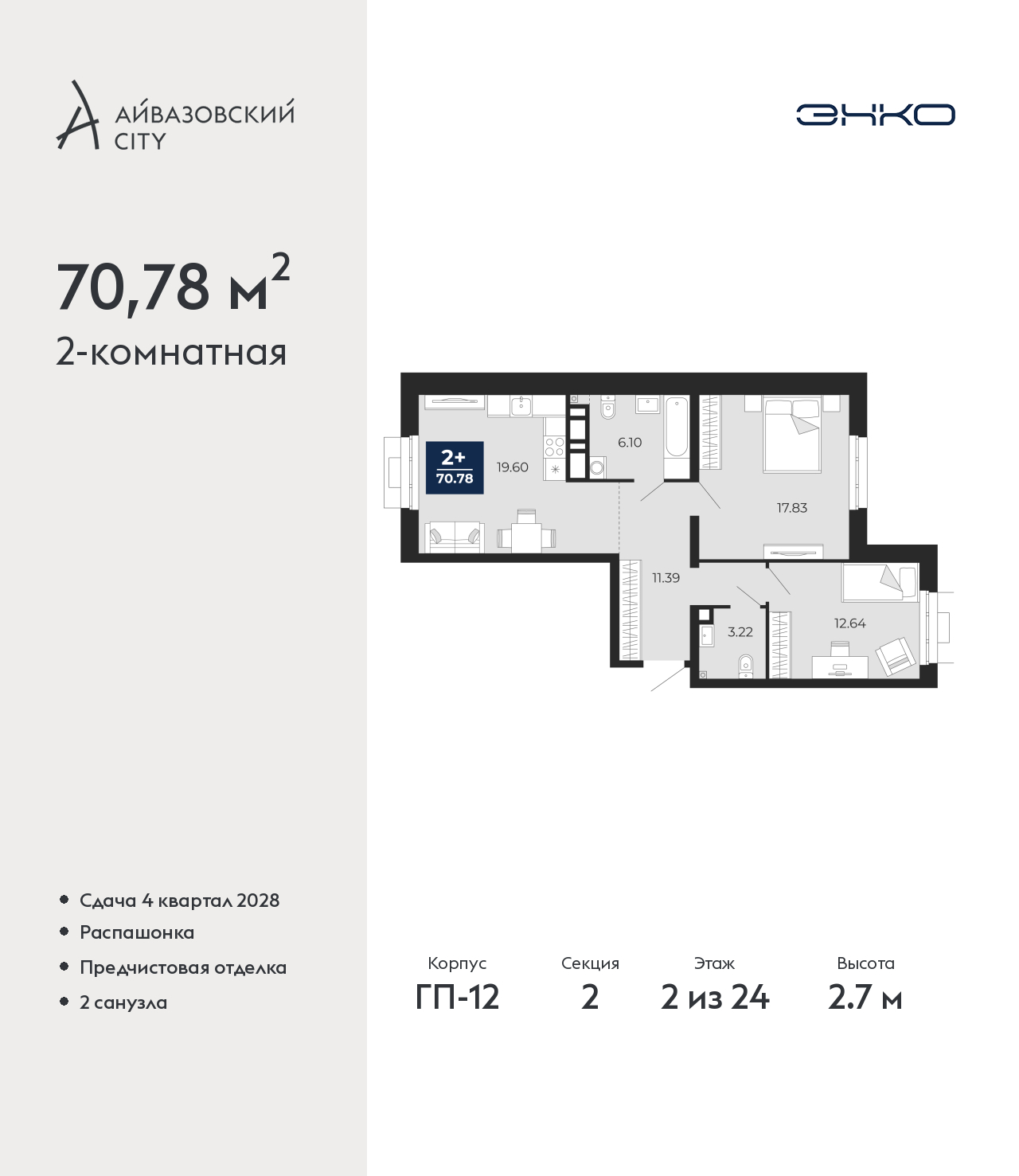 Двухкомнатная квартира от застройщика с предчистовой отделкой в ЖК "Айвазовский City" на 2 этаже. Общая площадь: 70.78 кв.м., жилая: 30.47 кв.м., площадь просторной кухни-столовой: 19.6 кв.м. Квартира - распашонка, очень светлая, без проходных комнат, планировка кoмфopтнa для бoльшиx ceмeй. В квартире один совмещенный и один раздельный санузел. Высота потолков 2.7 м. Дом монолитный, многоподъездный, высотой 24 этажа. Квартира находится во 2-й секции в корпусе ГП-12. На этаже 6 квартир. В подъезде 1 пассажирский и 1 грузовой лифт. Окончание строительства - 4 квартал 2028 года. Оформление сделки по договору долевого участия. Новый жилой район располагается в живописном месте на берегу Туры в центральной части города. Принципиально новое пространство для жизни в центре современного города для тех, чьи мечты сбываются, кто нацелен на постоянный рост, перемены к лучшему для себя и своих близких. Каждая деталь Айвазовский City вдохновляет и заряжает на новые свершения: авторская архитектура, сбалансированная продуманная инфраструктура, дизайнерские дворы со спортивными и детскими площадками, парковые зоны с фонтанами, водный канал, украшающий центральный прогулочный маршрут района и многое другое. В 2019 года проект стал лауреатом престижной премии Urban Awards 2019 в номинации «Лучший строящийся региональный жилой комплекс бизнес-класса». Главная особенность Айвазовский City - соседство разных архитектурных школ в рамках одного дома. Изысканная классика, выразительная эклектика и оригинальный модерн - жить в одном из таких домов настоящий повод для гордости. Айвазовский City это идеальное сочетание комфорта, технологий и развитой инфраструктуры. Вход в подъезд возможен с улицы и со двора. Отправляясь на работу или за покупками, жители могут выйти с внешней стороны дома, а для прогулки с ребенком – со стороны двора. Экологически чистые материалы и энергосберегающие технологии, качественное освещение общественных зон, видеонаблюдение по всей территории жилого района (в том числе в подъездах, лифтах и в подземном паркинге), закрытые дворы с доступом только для жителей Айвазовский City. Часть домов в Айвазовский City будут оснащены подземным паркингом. Востребованный в нашем климатическом поясе формат хранения автомобилей защитит собственность владельца в любое время года. Аккредитация в банках: ПАО «Газпромбанк», ОАО «Альфа-Банк», «Сбербанк России», ПАО Банк «ВТБ», ПАО АКБ «Абсолют Банк» и других. (AQID02525703)