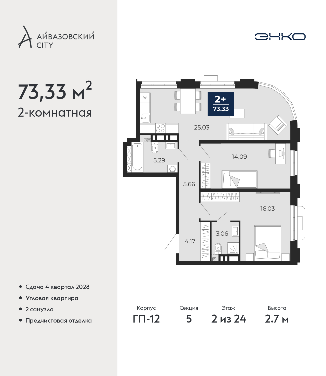 Двухкомнатная квартира с предчистовой отделкой в ЖК "Айвазовский City" на 2 этаже. Общая площадь: 73.33 кв.м., жилая: 30.12 кв.м., площадь просторной кухни-столовой: 25.03 кв.м. Угловая квартира, идеально подойдет любителям тишины и панорамных видов. В квартире два совмещенных санузла. Высота потолков 2.7 м. Дом монолитный, многоподъездный, высотой 24 этажа. Квартира находится в 5-й секции в корпусе ГП-12. На этаже 5 квартир. В подъезде 1 пассажирский и 1 грузовой лифт. Окончание строительства - 4 квартал 2028 года. Оформление сделки по договору долевого участия. Новый жилой район располагается в живописном месте на берегу Туры в центральной части города. Принципиально новое пространство для жизни в центре современного города для тех, чьи мечты сбываются, кто нацелен на постоянный рост, перемены к лучшему для себя и своих близких. Каждая деталь Айвазовский City вдохновляет и заряжает на новые свершения: авторская архитектура, сбалансированная продуманная инфраструктура, дизайнерские дворы со спортивными и детскими площадками, парковые зоны с фонтанами, водный канал, украшающий центральный прогулочный маршрут района и многое другое. В 2019 года проект стал лауреатом престижной премии Urban Awards 2019 в номинации «Лучший строящийся региональный жилой комплекс бизнес-класса». Главная особенность Айвазовский City - соседство разных архитектурных школ в рамках одного дома. Изысканная классика, выразительная эклектика и оригинальный модерн - жить в одном из таких домов настоящий повод для гордости. Айвазовский City это идеальное сочетание комфорта, технологий и развитой инфраструктуры. Вход в подъезд возможен с улицы и со двора. Отправляясь на работу или за покупками, жители могут выйти с внешней стороны дома, а для прогулки с ребенком – со стороны двора. Экологически чистые материалы и энергосберегающие технологии, качественное освещение общественных зон, видеонаблюдение по всей территории жилого района (в том числе в подъездах, лифтах и в подземном паркинге), закрытые дворы с доступом только для жителей Айвазовский City. Часть домов в Айвазовский City будут оснащены подземным паркингом. Востребованный в нашем климатическом поясе формат хранения автомобилей защитит собственность владельца в любое время года. Аккредитация в банках: ПАО Банк «ВТБ», ОАО «Альфа-Банк», ПАО «Газпромбанк», «Сбербанк России», АО "ДОМ.РФ" и других. (AQID02525724)