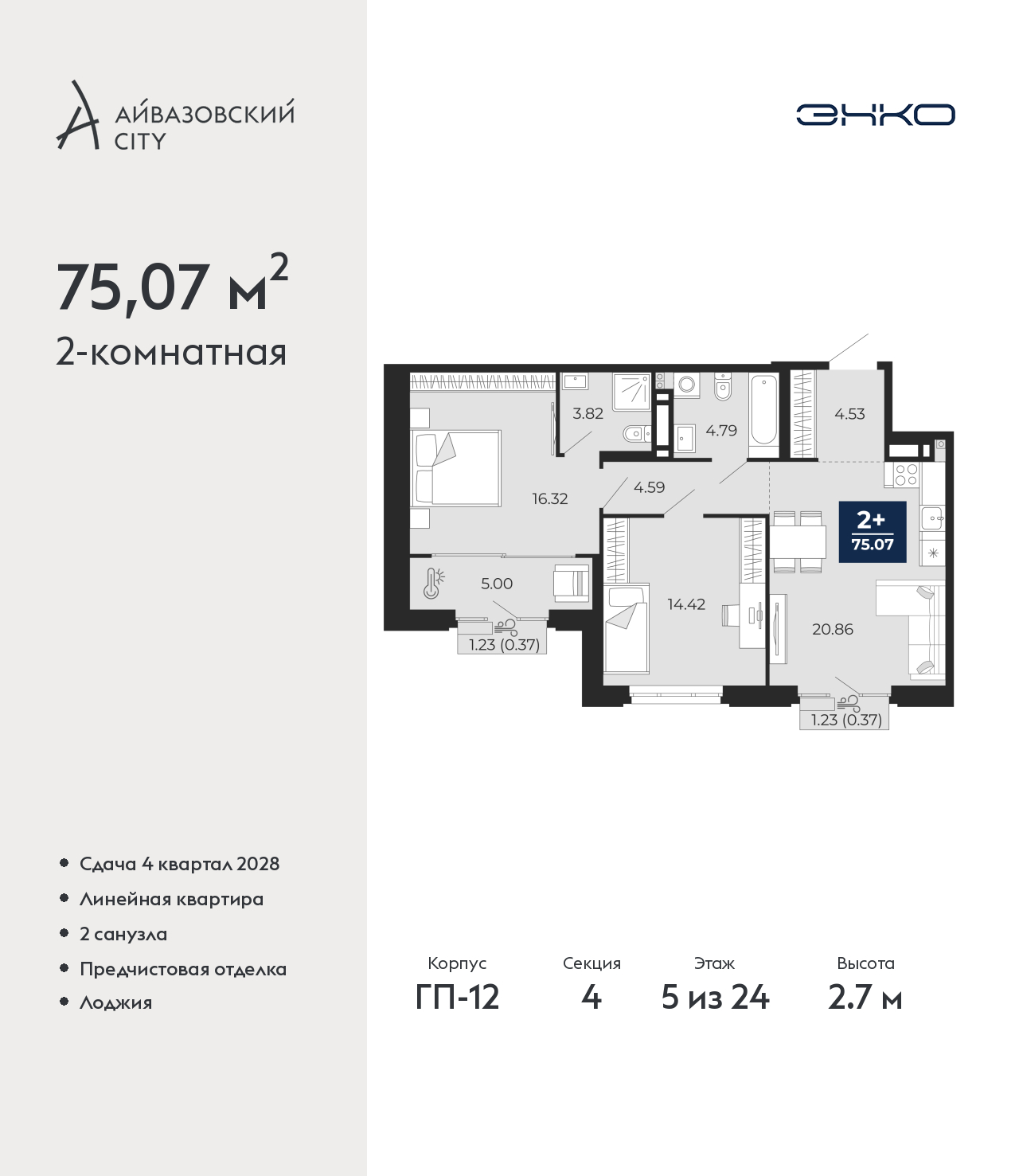 Продается 2-комн. квартира с предчистовой отделкой в ЖК "Айвазовский City" на 5 этаже. Общая площадь: 75.07 кв.м., жилая: 30.74 кв.м., площадь просторной кухни-столовой: 20.86 кв.м. Комнаты изолированные, все окна выходят на одну сторону. В квартире одна лоджия, два совмещенных санузла. Высота потолков 2.7 м. Дом монолитный, многоподъездный, высотой 24 этажа. Квартира находится в 4-й секции в корпусе ГП-12. На этаже 5 квартир. В подъезде 1 пассажирский и 1 грузовой лифт. Окончание строительства - 4 квартал 2028 года. Оформление сделки по договору долевого участия. Новый жилой район располагается в живописном месте на берегу Туры в центральной части города. Принципиально новое пространство для жизни в центре современного города для тех, чьи мечты сбываются, кто нацелен на постоянный рост, перемены к лучшему для себя и своих близких. Каждая деталь Айвазовский City вдохновляет и заряжает на новые свершения: авторская архитектура, сбалансированная продуманная инфраструктура, дизайнерские дворы со спортивными и детскими площадками, парковые зоны с фонтанами, водный канал, украшающий центральный прогулочный маршрут района и многое другое. В 2019 года проект стал лауреатом престижной премии Urban Awards 2019 в номинации «Лучший строящийся региональный жилой комплекс бизнес-класса». Главная особенность Айвазовский City - соседство разных архитектурных школ в рамках одного дома. Изысканная классика, выразительная эклектика и оригинальный модерн - жить в одном из таких домов настоящий повод для гордости. Айвазовский City это идеальное сочетание комфорта, технологий и развитой инфраструктуры. Вход в подъезд возможен с улицы и со двора. Отправляясь на работу или за покупками, жители могут выйти с внешней стороны дома, а для прогулки с ребенком – со стороны двора. Экологически чистые материалы и энергосберегающие технологии, качественное освещение общественных зон, видеонаблюдение по всей территории жилого района (в том числе в подъездах, лифтах и в подземном паркинге), закрытые дворы с доступом только для жителей Айвазовский City. Часть домов в Айвазовский City будут оснащены подземным паркингом. Востребованный в нашем климатическом поясе формат хранения автомобилей защитит собственность владельца в любое время года. Аккредитация в банках: ОАО «Альфа-Банк», ПАО Банк «ВТБ», ПАО «Газпромбанк», «Сбербанк России», ПАО «Промсвязьбанк» и других. (AQID02525731)