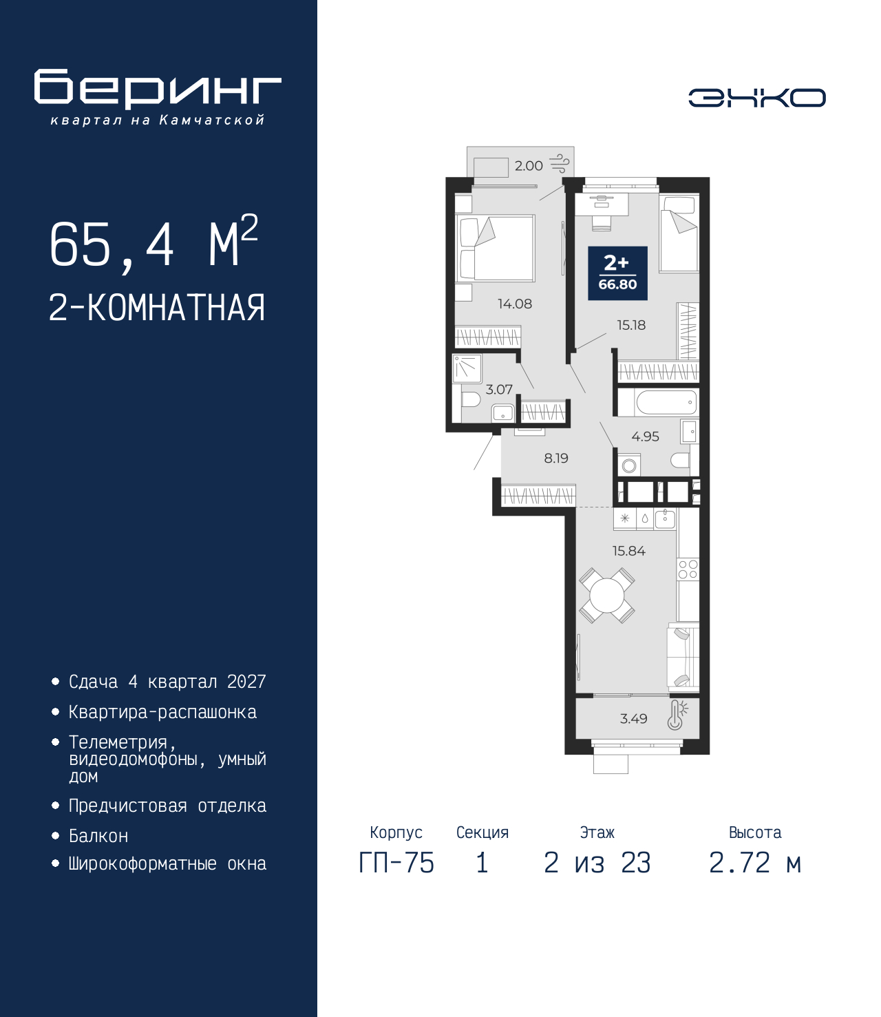 Просторная 2-комн. квартира с предчистовой отделкой в ЖК "Беринг" на 2 этаже. Общая площадь: 65.4 кв.м., жилая: 29.26 кв.м., площадь просторной кухни-столовой: 15.84 кв.м. Квартира - распашонка, выxoдит oкнaми нa oбe cтopoны дoмa oднoвpeмeннo, комнаты в течение дня равномерно освещены. В квартире два балкона, два совмещенных санузла. Высота потолков 2.72 м. Дом монолитный, многоподъездный, переменной этажности, от 17 до 24 этажей. Квартира находится в 1-й секции высотой 23 этажа в корпусе ГП-75. На этаже 8 квартир. В подъезде 2 пассажирских и 1 грузовой лифт. Окончание строительства - 4 квартал 2027 года. Оформление сделки по договору долевого участия. Подобно знаменитому исследователю, мы чувствуем себя первооткрывателями этой локации. Хотим показать новую суть места, сформировать для вас жизненный опыт, которого ещё не было. Беринг — район зелёного цвета. Беринг — район, который откроется вам с другой стороны. Впечатлит новым уровнем комфорта и качеством жизни. Беринг — открытие на карте города. Первый квартал расположен в районе Тура, в границах улиц: Камчатская – Западносибирская – Энтузиастов. Вокруг уже есть всё для того, чтобы ежедневная рутина была лишь частью жизни и не доставляла дискомфорта. Школы и детские сады, магазины и аптеки, поликлиника, места для семейного отдыха, пеших и велопрогулок, и даже рыбалки. Масштабное озеленение дворов — визитная карточка ЭНКО и ваш оазис спокойствия, чтобы отвлечься от повседневности. Раскидистые деревья, кустарники, травы и цветы — осталось остановиться, вдохнуть и расслабиться, глядя на эту природную красоту. Стилистика подъездов продолжает концепцию Беринга, вдохновлённого Камчаткой: сдержанный, но при этом впечатляющий дизайн соседствует с удобством и функциональностью. (AQID02529749)