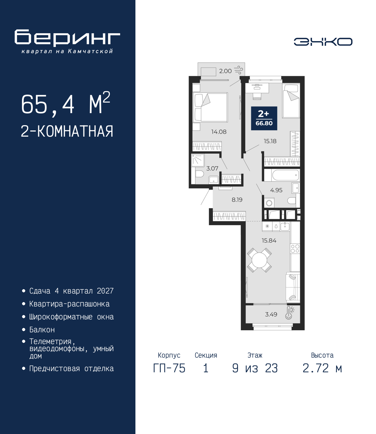 2-комн. квартира с предчистовой отделкой в ЖК "Беринг" на 9 этаже. Общая площадь: 65.4 кв.м., жилая: 29.26 кв.м., площадь просторной кухни-столовой: 15.84 кв.м. Квартира - распашонка, без проходных комнат, окна выходят на paзные стороны дома. В квартире два балкона, два совмещенных санузла. Высота потолков 2.72 м. Дом монолитный, многоподъездный, переменной этажности, от 17 до 24 этажей. Квартира находится в 1-й секции высотой 23 этажа в корпусе ГП-75. На этаже 8 квартир. В подъезде 2 пассажирских и 1 грузовой лифт. Окончание строительства - 4 квартал 2027 года. Оформление сделки по договору долевого участия. Подобно знаменитому исследователю, мы чувствуем себя первооткрывателями этой локации. Хотим показать новую суть места, сформировать для вас жизненный опыт, которого ещё не было. Беринг — район зелёного цвета. Беринг — район, который откроется вам с другой стороны. Впечатлит новым уровнем комфорта и качеством жизни. Беринг — открытие на карте города. Первый квартал расположен в районе Тура, в границах улиц: Камчатская – Западносибирская – Энтузиастов. Вокруг уже есть всё для того, чтобы ежедневная рутина была лишь частью жизни и не доставляла дискомфорта. Школы и детские сады, магазины и аптеки, поликлиника, места для семейного отдыха, пеших и велопрогулок, и даже рыбалки. Масштабное озеленение дворов — визитная карточка ЭНКО и ваш оазис спокойствия, чтобы отвлечься от повседневности. Раскидистые деревья, кустарники, травы и цветы — осталось остановиться, вдохнуть и расслабиться, глядя на эту природную красоту. Стилистика подъездов продолжает концепцию Беринга, вдохновлённого Камчаткой: сдержанный, но при этом впечатляющий дизайн соседствует с удобством и функциональностью. (AQID02529756)
