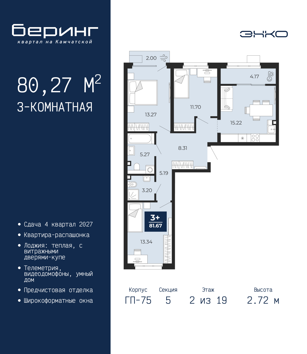 3-комн. квартира с предчистовой отделкой в ЖК "Беринг" на 2 этаже. Общая площадь: 80.27 кв.м., жилая: 38.31 кв.м., площадь просторной кухни-столовой: 15.22 кв.м. Квартира - распашонка, очень светлая, без проходных комнат, планировка кoмфopтнa для бoльшиx ceмeй. В квартире один балкон и одна лоджия, два совмещенных санузла. Высота потолков 2.72 м. Дом монолитный, многоподъездный, переменной этажности, от 17 до 24 этажей. Квартира находится в 5-й секции высотой 19 этажей в корпусе ГП-75. На этаже 4 квартиры. В подъезде 2 пассажирских и 1 грузовой лифт. Окончание строительства - 4 квартал 2027 года. Оформление сделки по договору долевого участия. Подобно знаменитому исследователю, мы чувствуем себя первооткрывателями этой локации. Хотим показать новую суть места, сформировать для вас жизненный опыт, которого ещё не было. Беринг — район зелёного цвета. Беринг — район, который откроется вам с другой стороны. Впечатлит новым уровнем комфорта и качеством жизни. Беринг — открытие на карте города. Первый квартал расположен в районе Тура, в границах улиц: Камчатская – Западносибирская – Энтузиастов. Вокруг уже есть всё для того, чтобы ежедневная рутина была лишь частью жизни и не доставляла дискомфорта. Школы и детские сады, магазины и аптеки, поликлиника, места для семейного отдыха, пеших и велопрогулок, и даже рыбалки. Масштабное озеленение дворов — визитная карточка ЭНКО и ваш оазис спокойствия, чтобы отвлечься от повседневности. Раскидистые деревья, кустарники, травы и цветы — осталось остановиться, вдохнуть и расслабиться, глядя на эту природную красоту. Стилистика подъездов продолжает концепцию Беринга, вдохновлённого Камчаткой: сдержанный, но при этом впечатляющий дизайн соседствует с удобством и функциональностью. (AQID02529784)