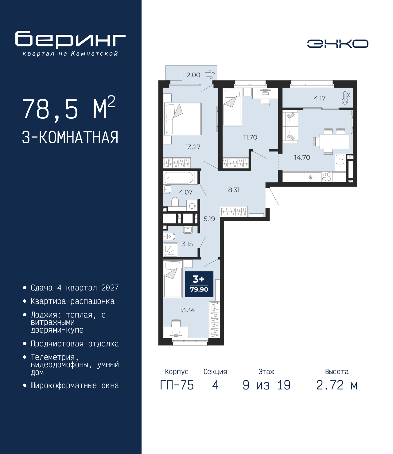 - Общая площадь 78.5 м²