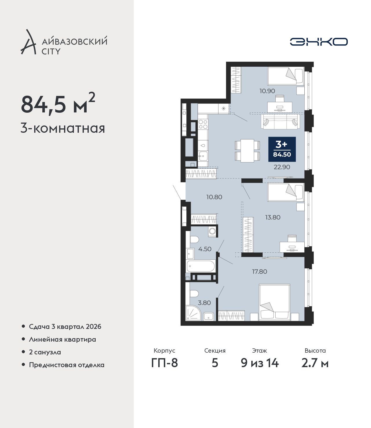 Трехкомнатная квартира от застройщика с предчистовой отделкой в ЖК "Айвазовский City" на 9 этаже. Общая площадь: 84.5 кв.м., жилая: 42.5 кв.м., площадь просторной кухни-столовой: 22.9 кв.м. Комнаты изолированные, все окна выходят на одну сторону. В квартире два совмещенных санузла. Высота потолков 2.7 м. Дом монолитный, многоподъездный, переменной этажности, от 14 до 24 этажей. Квартира находится в 5-й секции высотой 14 этажей в корпусе ГП-8. На этаже 5 квартир. В подъезде 1 пассажирский и 1 грузовой лифт. Окончание строительства - 3 квартал 2026 года. Оформление сделки по договору долевого участия. Новый жилой район располагается в живописном месте на берегу Туры в центральной части города. Принципиально новое пространство для жизни в центре современного города для тех, чьи мечты сбываются, кто нацелен на постоянный рост, перемены к лучшему для себя и своих близких. Каждая деталь Айвазовский City вдохновляет и заряжает на новые свершения: авторская архитектура, сбалансированная продуманная инфраструктура, дизайнерские дворы со спортивными и детскими площадками, парковые зоны с фонтанами, водный канал, украшающий центральный прогулочный маршрут района и многое другое. В 2019 года проект стал лауреатом престижной премии Urban Awards 2019 в номинации «Лучший строящийся региональный жилой комплекс бизнес-класса». Главная особенность Айвазовский City - соседство разных архитектурных школ в рамках одного дома. Изысканная классика, выразительная эклектика и оригинальный модерн - жить в одном из таких домов настоящий повод для гордости. Айвазовский City это идеальное сочетание комфорта, технологий и развитой инфраструктуры. Вход в подъезд возможен с улицы и со двора. Отправляясь на работу или за покупками, жители могут выйти с внешней стороны дома, а для прогулки с ребенком – со стороны двора. Экологически чистые материалы и энергосберегающие технологии, качественное освещение общественных зон, видеонаблюдение по всей территории жилого района (в том числе в подъездах, лифтах и в подземном паркинге), закрытые дворы с доступом только для жителей Айвазовский City. Часть домов в Айвазовский City будут оснащены подземным паркингом. Востребованный в нашем климатическом поясе формат хранения автомобилей защитит собственность владельца в любое время года. Аккредитация в банках: «Сбербанк России», ПАО Банк «ВТБ», ПАО «Газпромбанк», ОАО «Альфа-Банк», ПАО «Промсвязьбанк» и других. (AQID02453779)