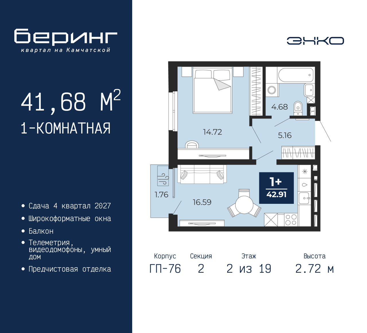 Просторная 1-комн. квартира с предчистовой отделкой в ЖК "Беринг" на 2 этаже. Общая площадь: 41.68 кв.м., жилая: 14.72 кв.м., площадь просторной кухни-столовой: 16.59 кв.м. Все окна выходят на одну сторону. В квартире один балкон, один совмещенный санузел. Высота потолков 2.72 м. Дом монолитный, черырехподъездный, переменной этажности, от 19 до 24 этажей. Квартира находится во 2-й секции высотой 19 этажей в корпусе ГП-76. На этаже 8 квартир. В подъезде 1 пассажирский и 1 грузовой лифт. Окончание строительства - 4 квартал 2027 года. Оформление сделки по договору долевого участия. Подобно знаменитому исследователю, мы чувствуем себя первооткрывателями этой локации. Хотим показать новую суть места, сформировать для вас жизненный опыт, которого ещё не было. Беринг — район зелёного цвета. Беринг — район, который откроется вам с другой стороны. Впечатлит новым уровнем комфорта и качеством жизни. Беринг — открытие на карте города. Первый квартал расположен в районе Тура, в границах улиц: Камчатская – Западносибирская – Энтузиастов. Вокруг уже есть всё для того, чтобы ежедневная рутина была лишь частью жизни и не доставляла дискомфорта. Школы и детские сады, магазины и аптеки, поликлиника, места для семейного отдыха, пеших и велопрогулок, и даже рыбалки. Масштабное озеленение дворов — визитная карточка ЭНКО и ваш оазис спокойствия, чтобы отвлечься от повседневности. Раскидистые деревья, кустарники, травы и цветы — осталось остановиться, вдохнуть и расслабиться, глядя на эту природную красоту. Стилистика подъездов продолжает концепцию Беринга, вдохновлённого Камчаткой: сдержанный, но при этом впечатляющий дизайн соседствует с удобством и функциональностью. (AQID02518039)