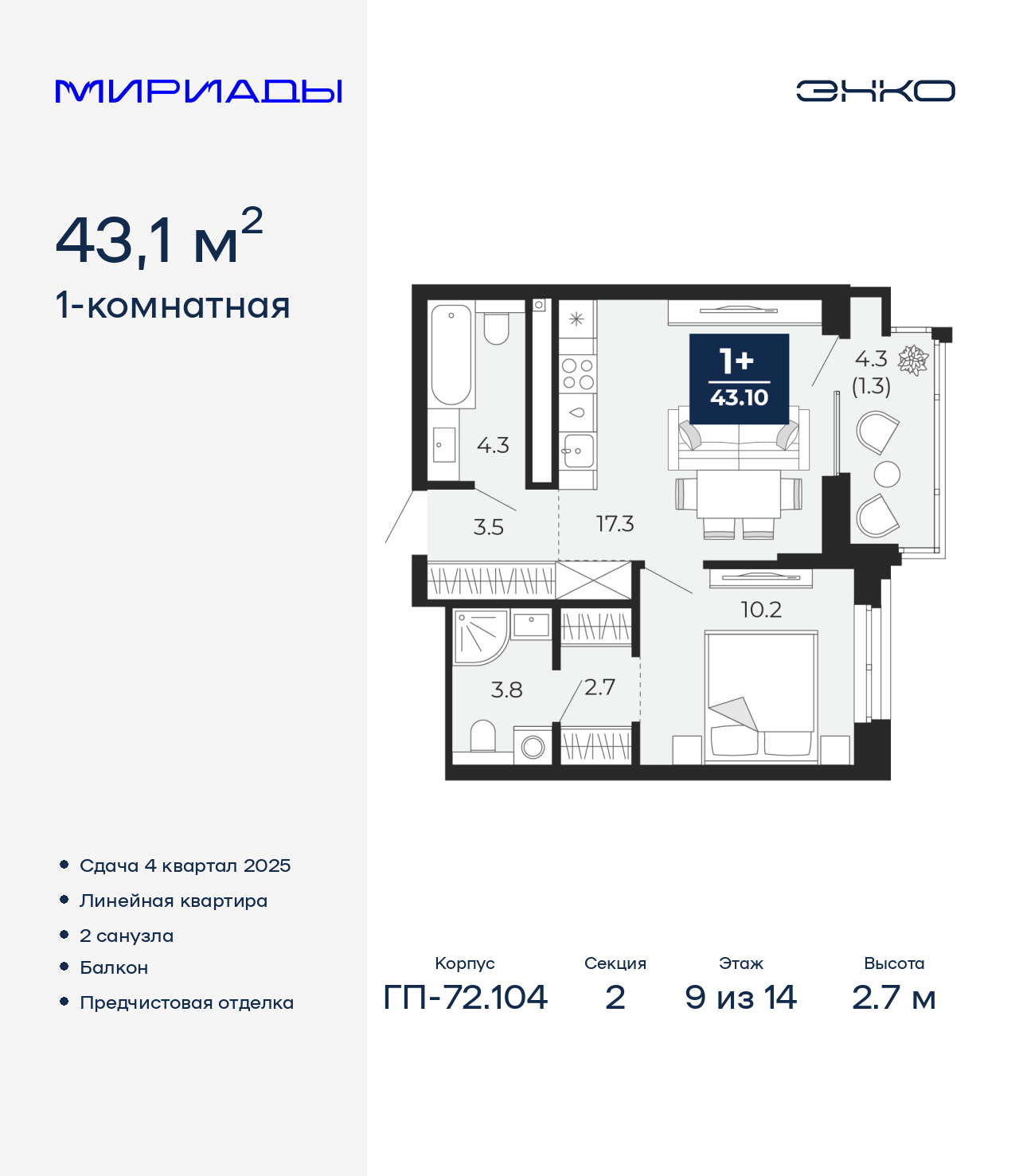 1-комн. квартира с предчистовой отделкой в ЖК "Мириады" на 9 этаже. Общая площадь: 43.1 кв.м., жилая: 10.2 кв.м., площадь просторной кухни-столовой: 17.3 кв.м. Все окна выходят на одну сторону. В квартире один балкон, два совмещенных санузла. Высота потолков 2.7 м. Дом монолитный, двухподъездный, переменной этажности, от 14 до 18 этажей. Квартира находится во 2-й секции высотой 14 этажей в корпусе ГП-72.104. На этаже 8 квартир. В подъезде 1 пассажирский и 1 грузовой лифт. Окончание строительства - 4 квартал 2025 года. Оформление сделки по договору долевого участия. Вселенная бесконечных историй. Ранее невиданный Тюмени масштаб: территория 240 гектаров и 1 650 000 м² застройки. Мириады – это город масштабных перемен и больших возможностей. Город зеленых рощ и зеркальных озер. Город для работы, учебы и развлечений. Город для детей и их родителей. Город для всех и каждого. Проект расположен в районе Мыс рядом с ТРЦ «Тюмень Сити Молл» в границах улицы Тимофея Чаркова, Тобольского тракта и объездной дороги. Срок полного освоения территории - до 2034 года. (AQID02522624)