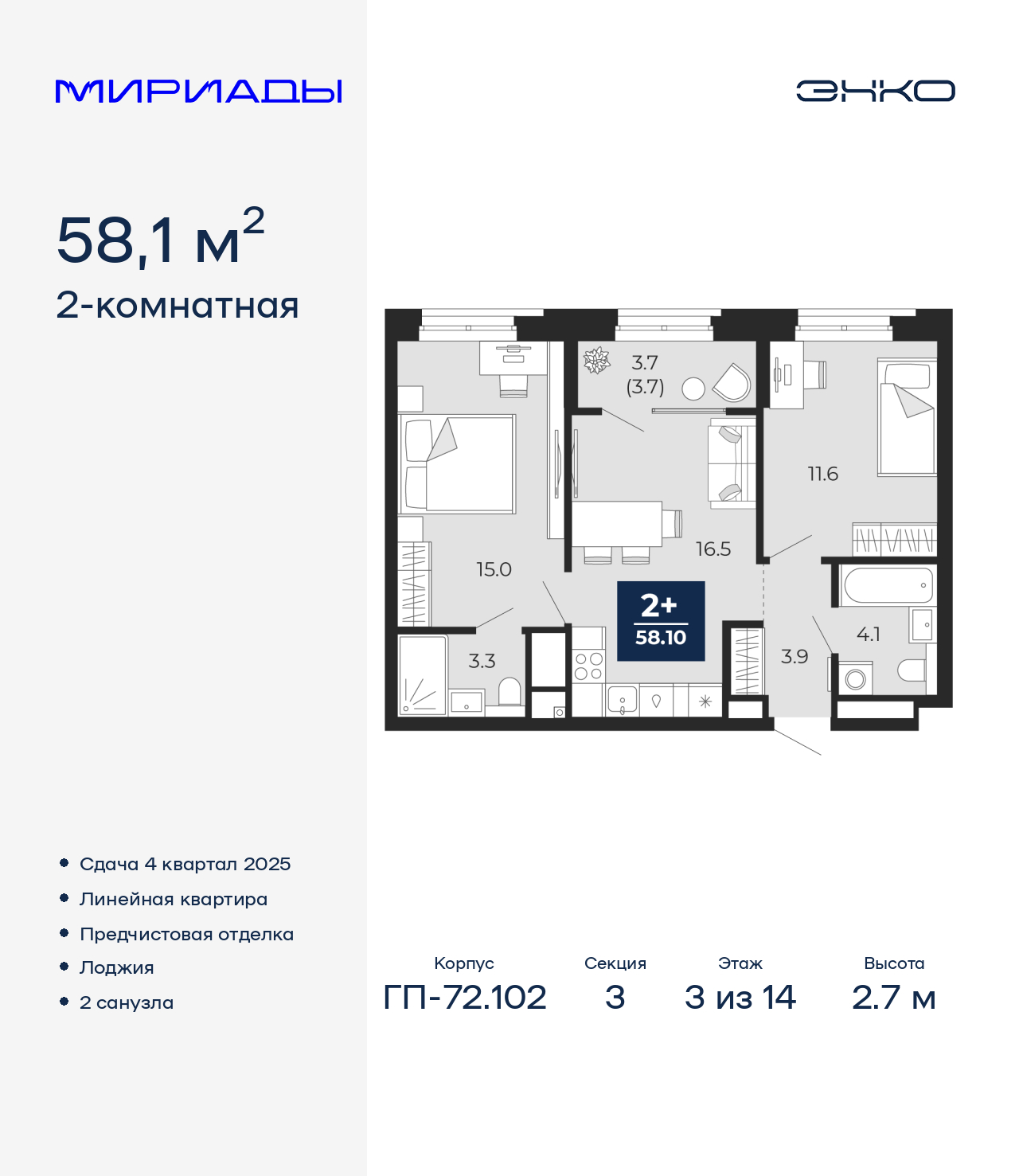 2-комн. квартира от застройщика с предчистовой отделкой в ЖК "Мириады" на 3 этаже. Общая площадь: 58.1 кв.м., жилая: 26.6 кв.м., площадь просторной кухни-столовой: 16.5 кв.м. Комнаты изолированные, все окна выходят на одну сторону. В квартире одна лоджия, два совмещенных санузла. Высота потолков 2.7 м. Дом монолитный, многоподъездный, переменной этажности, от 14 до 16 этажей. Квартира находится в 3-й секции высотой 14 этажей в корпусе ГП-72.102. На этаже 5 квартир. В подъезде 1 пассажирский и 1 грузовой лифт. Окончание строительства - 4 квартал 2025 года. Оформление сделки по договору долевого участия. Вселенная бесконечных историй. Ранее невиданный Тюмени масштаб: территория 240 гектаров и 1 650 000 м² застройки. Мириады – это город масштабных перемен и больших возможностей. Город зеленых рощ и зеркальных озер. Город для работы, учебы и развлечений. Город для детей и их родителей. Город для всех и каждого. Проект расположен в районе Мыс рядом с ТРЦ «Тюмень Сити Молл» в границах улицы Тимофея Чаркова, Тобольского тракта и объездной дороги. Срок полного освоения территории - до 2034 года. (AQID02522715)
