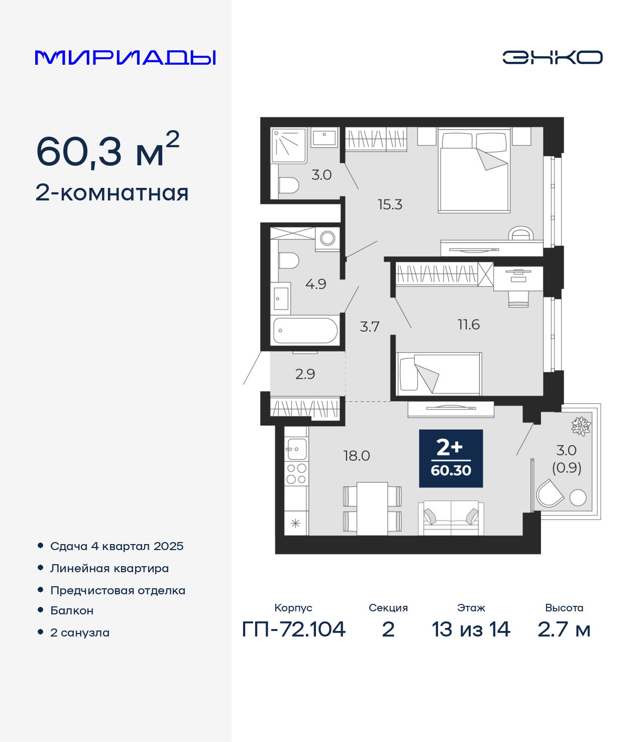2-комн. квартира от застройщика с предчистовой отделкой в ЖК "Мириады" на 13 этаже. Общая площадь: 60.3 кв.м., жилая: 26.9 кв.м., площадь просторной кухни-столовой: 18 кв.м. Комнаты изолированные, все окна выходят на одну сторону. В квартире один балкон, два совмещенных санузла. Высота потолков 2.7 м. Дом монолитный, двухподъездный, переменной этажности, от 14 до 18 этажей. Квартира находится во 2-й секции высотой 14 этажей в корпусе ГП-72.104. На этаже 8 квартир. В подъезде 1 пассажирский и 1 грузовой лифт. Окончание строительства - 4 квартал 2025 года. Оформление сделки по договору долевого участия. Вселенная бесконечных историй. Ранее невиданный Тюмени масштаб: территория 240 гектаров и 1 650 000 м² застройки. Мириады – это город масштабных перемен и больших возможностей. Город зеленых рощ и зеркальных озер. Город для работы, учебы и развлечений. Город для детей и их родителей. Город для всех и каждого. Проект расположен в районе Мыс рядом с ТРЦ «Тюмень Сити Молл» в границах улицы Тимофея Чаркова, Тобольского тракта и объездной дороги. Срок полного освоения территории - до 2034 года. (AQID02522722)