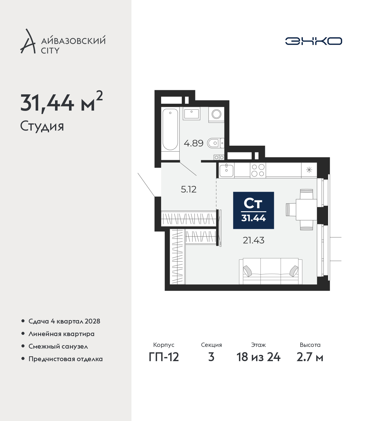 1-комн. квартира-студия с предчистовой отделкой в ЖК "Айвазовский City" на 18 этаже. Общая площадь: 31.44 кв.м., площадь гостиной 21.43 кв.м., из которых 5 кв.м. выделено под кухонную зону. Все окна выходят на одну сторону. В квартире один совмещенный санузел. Высота потолков 2.7 м. Дом монолитный, многоподъездный, высотой 24 этажа. Квартира находится в 3-й секции в корпусе ГП-12. На этаже 6 квартир. В подъезде 1 пассажирский и 1 грузовой лифт. Окончание строительства - 4 квартал 2028 года. Оформление сделки по договору долевого участия. Новый жилой район располагается в живописном месте на берегу Туры в центральной части города. Принципиально новое пространство для жизни в центре современного города для тех, чьи мечты сбываются, кто нацелен на постоянный рост, перемены к лучшему для себя и своих близких. Каждая деталь Айвазовский City вдохновляет и заряжает на новые свершения: авторская архитектура, сбалансированная продуманная инфраструктура, дизайнерские дворы со спортивными и детскими площадками, парковые зоны с фонтанами, водный канал, украшающий центральный прогулочный маршрут района и многое другое. В 2019 года проект стал лауреатом престижной премии Urban Awards 2019 в номинации «Лучший строящийся региональный жилой комплекс бизнес-класса». Главная особенность Айвазовский City - соседство разных архитектурных школ в рамках одного дома. Изысканная классика, выразительная эклектика и оригинальный модерн - жить в одном из таких домов настоящий повод для гордости. Айвазовский City это идеальное сочетание комфорта, технологий и развитой инфраструктуры. Вход в подъезд возможен с улицы и со двора. Отправляясь на работу или за покупками, жители могут выйти с внешней стороны дома, а для прогулки с ребенком – со стороны двора. Экологически чистые материалы и энергосберегающие технологии, качественное освещение общественных зон, видеонаблюдение по всей территории жилого района (в том числе в подъездах, лифтах и в подземном паркинге), закрытые дворы с доступом только для жителей Айвазовский City. Часть домов в Айвазовский City будут оснащены подземным паркингом. Востребованный в нашем климатическом поясе формат хранения автомобилей защитит собственность владельца в любое время года. Аккредитация в банках: ОАО «Альфа-Банк», «Сбербанк России», ПАО Банк «ВТБ», ПАО «Газпромбанк», ПАО АКБ «Абсолют Банк» и других. (AQID02525515)