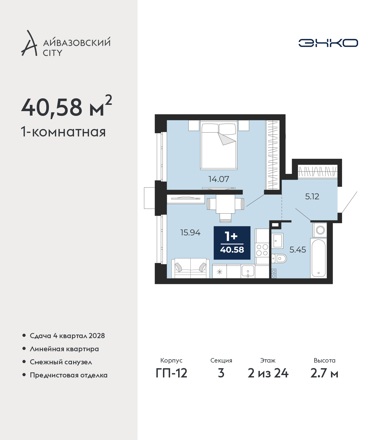 Однокомнатная квартира с предчистовой отделкой в ЖК "Айвазовский City" на 2 этаже. Общая площадь: 40.58 кв.м., жилая: 14.07 кв.м., площадь просторной кухни-столовой: 15.94 кв.м. Все окна выходят на одну сторону. В квартире один совмещенный санузел. Высота потолков 2.7 м. Дом монолитный, многоподъездный, высотой 24 этажа. Квартира находится в 3-й секции в корпусе ГП-12. На этаже 6 квартир. В подъезде 1 пассажирский и 1 грузовой лифт. Окончание строительства - 4 квартал 2028 года. Оформление сделки по договору долевого участия. Новый жилой район располагается в живописном месте на берегу Туры в центральной части города. Принципиально новое пространство для жизни в центре современного города для тех, чьи мечты сбываются, кто нацелен на постоянный рост, перемены к лучшему для себя и своих близких. Каждая деталь Айвазовский City вдохновляет и заряжает на новые свершения: авторская архитектура, сбалансированная продуманная инфраструктура, дизайнерские дворы со спортивными и детскими площадками, парковые зоны с фонтанами, водный канал, украшающий центральный прогулочный маршрут района и многое другое. В 2019 года проект стал лауреатом престижной премии Urban Awards 2019 в номинации «Лучший строящийся региональный жилой комплекс бизнес-класса». Главная особенность Айвазовский City - соседство разных архитектурных школ в рамках одного дома. Изысканная классика, выразительная эклектика и оригинальный модерн - жить в одном из таких домов настоящий повод для гордости. Айвазовский City это идеальное сочетание комфорта, технологий и развитой инфраструктуры. Вход в подъезд возможен с улицы и со двора. Отправляясь на работу или за покупками, жители могут выйти с внешней стороны дома, а для прогулки с ребенком – со стороны двора. Экологически чистые материалы и энергосберегающие технологии, качественное освещение общественных зон, видеонаблюдение по всей территории жилого района (в том числе в подъездах, лифтах и в подземном паркинге), закрытые дворы с доступом только для жителей Айвазовский City. Часть домов в Айвазовский City будут оснащены подземным паркингом. Востребованный в нашем климатическом поясе формат хранения автомобилей защитит собственность владельца в любое время года. Аккредитация в банках: ПАО «Газпромбанк», «Сбербанк России», ПАО Банк «ВТБ», ОАО «Альфа-Банк», ПАО Банк «ФК Открытие» и других. (AQID02525522)