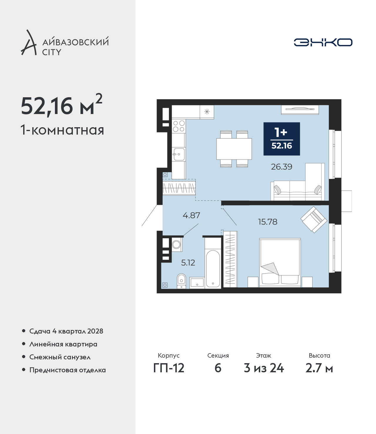 Однокомнатная квартира с предчистовой отделкой в ЖК "Айвазовский City" на 3 этаже. Общая площадь: 52.16 кв.м., жилая: 15.78 кв.м., площадь просторной кухни-столовой: 26.39 кв.м. Все окна выходят на одну сторону. В квартире один совмещенный санузел. Высота потолков 2.7 м. Дом монолитный, многоподъездный, высотой 24 этажа. Квартира находится в 6-й секции в корпусе ГП-12. На этаже 5 квартир. В подъезде 1 пассажирский и 1 грузовой лифт. Окончание строительства - 4 квартал 2028 года. Оформление сделки по договору долевого участия. Новый жилой район располагается в живописном месте на берегу Туры в центральной части города. Принципиально новое пространство для жизни в центре современного города для тех, чьи мечты сбываются, кто нацелен на постоянный рост, перемены к лучшему для себя и своих близких. Каждая деталь Айвазовский City вдохновляет и заряжает на новые свершения: авторская архитектура, сбалансированная продуманная инфраструктура, дизайнерские дворы со спортивными и детскими площадками, парковые зоны с фонтанами, водный канал, украшающий центральный прогулочный маршрут района и многое другое. В 2019 года проект стал лауреатом престижной премии Urban Awards 2019 в номинации «Лучший строящийся региональный жилой комплекс бизнес-класса». Главная особенность Айвазовский City - соседство разных архитектурных школ в рамках одного дома. Изысканная классика, выразительная эклектика и оригинальный модерн - жить в одном из таких домов настоящий повод для гордости. Айвазовский City это идеальное сочетание комфорта, технологий и развитой инфраструктуры. Вход в подъезд возможен с улицы и со двора. Отправляясь на работу или за покупками, жители могут выйти с внешней стороны дома, а для прогулки с ребенком – со стороны двора. Экологически чистые материалы и энергосберегающие технологии, качественное освещение общественных зон, видеонаблюдение по всей территории жилого района (в том числе в подъездах, лифтах и в подземном паркинге), закрытые дворы с доступом только для жителей Айвазовский City. Часть домов в Айвазовский City будут оснащены подземным паркингом. Востребованный в нашем климатическом поясе формат хранения автомобилей защитит собственность владельца в любое время года. Аккредитация в банках: «Сбербанк России», ОАО «Альфа-Банк», ПАО Банк «ВТБ», ПАО «Газпромбанк», ПАО АКБ «Абсолют Банк» и других. (AQID02525655)
