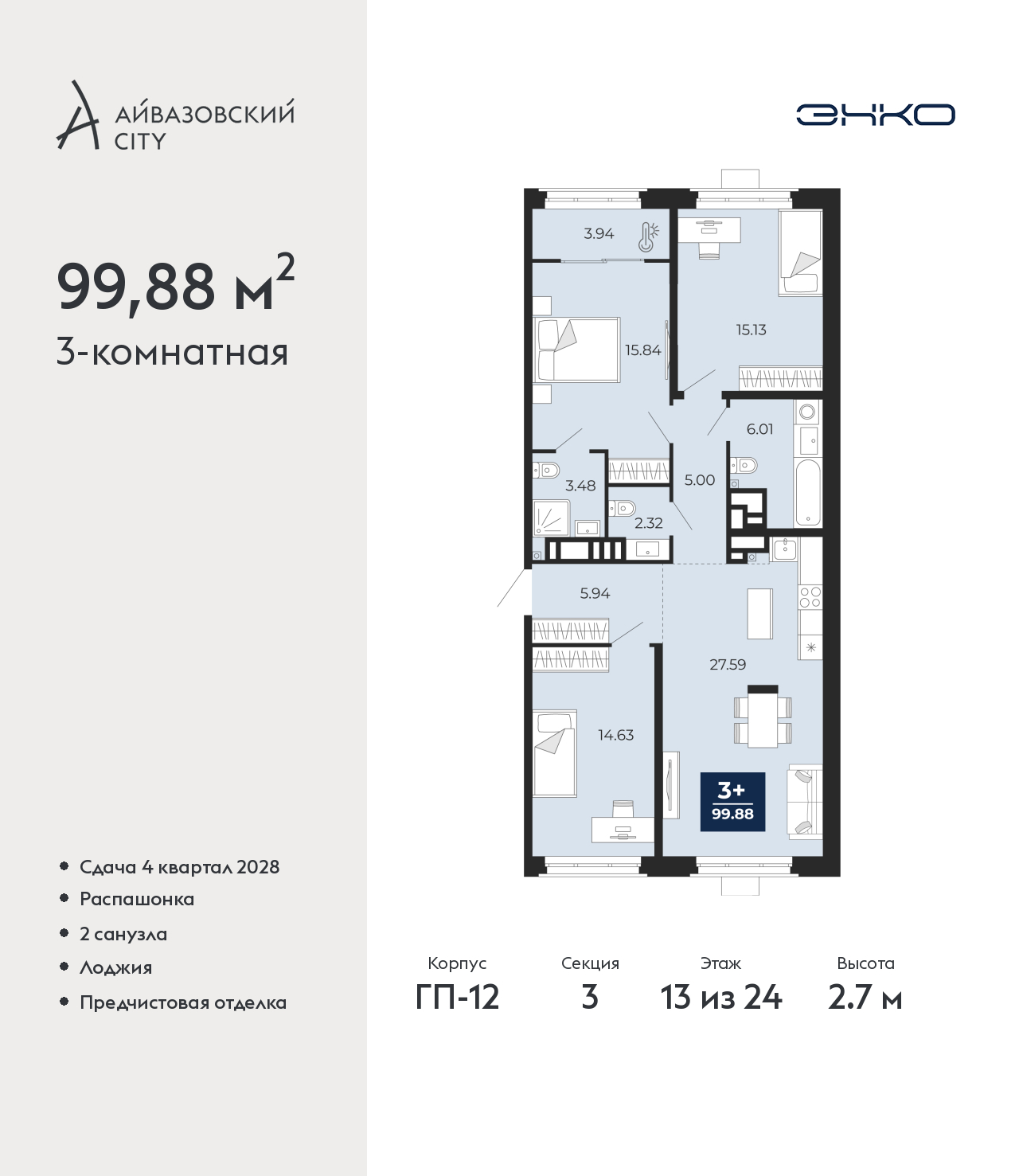 Просторная трехкомнатная квартира с предчистовой отделкой в ЖК "Айвазовский City" на 13 этаже. Общая площадь: 99.88 кв.м., жилая: 45.6 кв.м., площадь просторной кухни-столовой: 27.59 кв.м. Квартира - распашонка, без проходных комнат, окна выходят на paзные стороны дома. В квартире одна лоджия, два совмещенных санузла. Высота потолков 2.7 м. Дом монолитный, многоподъездный, высотой 24 этажа. Квартира находится в 3-й секции в корпусе ГП-12. На этаже 6 квартир. В подъезде 1 пассажирский и 1 грузовой лифт. Окончание строительства - 4 квартал 2028 года. Оформление сделки по договору долевого участия. Новый жилой район располагается в живописном месте на берегу Туры в центральной части города. Принципиально новое пространство для жизни в центре современного города для тех, чьи мечты сбываются, кто нацелен на постоянный рост, перемены к лучшему для себя и своих близких. Каждая деталь Айвазовский City вдохновляет и заряжает на новые свершения: авторская архитектура, сбалансированная продуманная инфраструктура, дизайнерские дворы со спортивными и детскими площадками, парковые зоны с фонтанами, водный канал, украшающий центральный прогулочный маршрут района и многое другое. В 2019 года проект стал лауреатом престижной премии Urban Awards 2019 в номинации «Лучший строящийся региональный жилой комплекс бизнес-класса». Главная особенность Айвазовский City - соседство разных архитектурных школ в рамках одного дома. Изысканная классика, выразительная эклектика и оригинальный модерн - жить в одном из таких домов настоящий повод для гордости. Айвазовский City это идеальное сочетание комфорта, технологий и развитой инфраструктуры. Вход в подъезд возможен с улицы и со двора. Отправляясь на работу или за покупками, жители могут выйти с внешней стороны дома, а для прогулки с ребенком – со стороны двора. Экологически чистые материалы и энергосберегающие технологии, качественное освещение общественных зон, видеонаблюдение по всей территории жилого района (в том числе в подъездах, лифтах и в подземном паркинге), закрытые дворы с доступом только для жителей Айвазовский City. Часть домов в Айвазовский City будут оснащены подземным паркингом. Востребованный в нашем климатическом поясе формат хранения автомобилей защитит собственность владельца в любое время года. Аккредитация в банках: «Сбербанк России», ОАО «Альфа-Банк», ПАО «Газпромбанк», ПАО Банк «ВТБ», АО "ДОМ.РФ" и других. (AQID02525774)