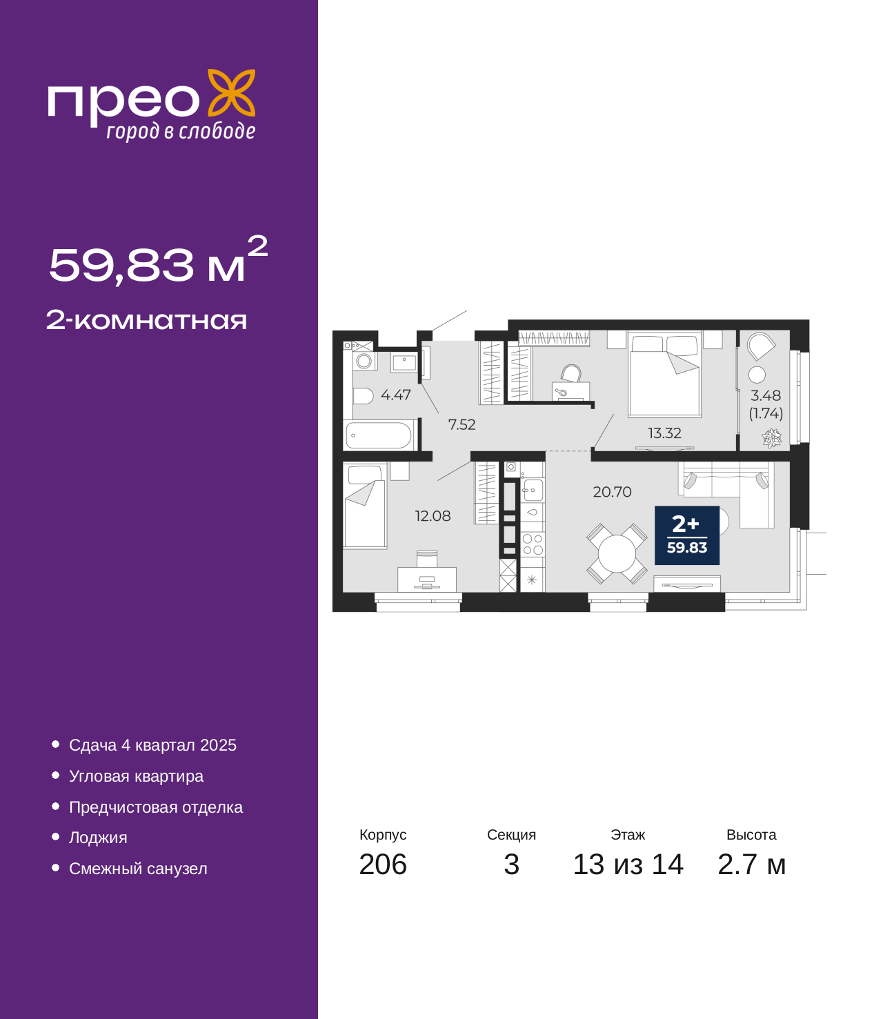 2-комн. квартира с предчистовой отделкой в ЖК "Прео" на 13 этаже. Общая площадь: 59.83 кв.м., жилая: 25.4 кв.м., площадь просторной кухни-столовой: 20.7 кв.м. Квартира угловая, очень светлая, естественная вентиляция при открытии окон. В квартире одна лоджия, один совмещенный санузел. Высота потолков 2.7 м. Дом монолитный, трехподъездный, переменной этажности, от 14 до 23 этажей. Квартира находится в 3-й секции высотой 14 этажей в корпусе 206. На этаже 6 квартир. В подъезде 1 пассажирский и 1 грузовой лифт. Окончание строительства - 4 квартал 2025 года. Оформление сделки по договору долевого участия. Преображенский — один из самых привлекательных районов для жизни! Это полностью самостоятельный жилой район с точки зрения инфраструктуры. Преображенский находится между Московским и Червишевским трактами в квартале улиц Закалужская — Вьюжная — Александра Протозанова. Не нужно ждать, когда появится инфраструктура — переезжайте на всё готовое. Вблизи расположены действующие школа и детский сад. В этом году откроется еще один сад, а в следующем году — школа. По соседству с Преображенским запланировано строительство городского парка «Комарово» площадью 38 гектар. За 10 минут можно доехать на автомобиле до крупных ТРЦ: «Лента», «Кристалл», «Леруа Мерлен», «Метро» и «Ашан». С 2018 года в районе открыт Соседский центр — пространство, созданное для формирования добрососедской среды, совместного досуга, общения и реализации соседских инициатив. Здесь проходят встречи соседей, а также сами жители района организовывают мероприятия. Организатором такого события может стать любой желающий. В квартирах выполнена качественная предчистовая отделка. Гладкие стены с финишным выравниванием по маякам. Ровный потолок для установки натяжного потолка. Установлены пятикамерные окна с двойным стеклопакетом (3 стекла). Дизайнерские холлы с видеонаблюдением, безбарьерным и прозрачным входом – всегда светло и спокойно. На первом этаже есть просторные колясочные, где все жители могут оставлять свои коляски и велосипеды. В Преображенском есть всё, что нужно для активного отдыха и занятий спортом. Мы сделали большое футбольное поле с безопасным покрытием. Также установили хоккейный корт, который оборудован по всем необходимым стандартам. Во дворах можно делать упражнения на специальных площадках с турниками. Весь район мы обустроили велодорожками, которые связаны в единый маршрут. У нас есть сухие фонтаны, бьющие из земли, деревья, веревки, сетки, скалодром, газон, песок и резинка — осталось просто дать своему ребенку право на свободную игру. По-настоящему хорошие дворы — это те, которые дети предпочитают соцсетям и телевизору. (AQID02527006)