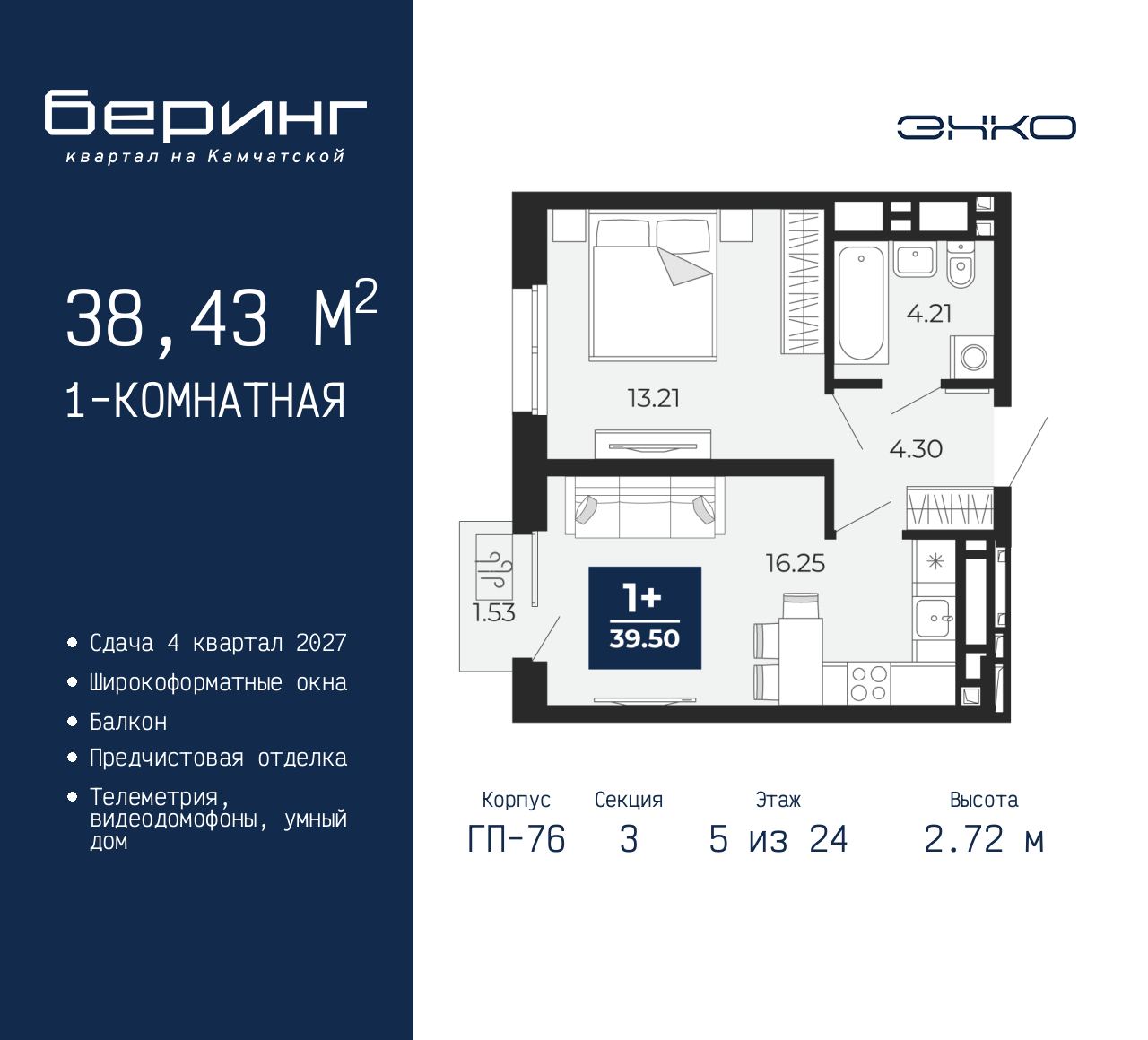 Однокомнатная квартира от застройщика с предчистовой отделкой в ЖК "Беринг" на 5 этаже. Общая площадь: 38.43 кв.м., жилая: 13.21 кв.м., площадь просторной кухни-столовой: 16.25 кв.м. Все окна выходят на одну сторону. В квартире один балкон, один совмещенный санузел. Высота потолков 2.72 м. Дом монолитный, черырехподъездный, переменной этажности, от 19 до 24 этажей. Квартира находится в 3-й секции высотой 24 этажа в корпусе ГП-76. На этаже 6 квартир. В подъезде 1 пассажирский и 1 грузовой лифт. Окончание строительства - 4 квартал 2027 года. Оформление сделки по договору долевого участия. Подобно знаменитому исследователю, мы чувствуем себя первооткрывателями этой локации. Хотим показать новую суть места, сформировать для вас жизненный опыт, которого ещё не было. Беринг — район зелёного цвета. Беринг — район, который откроется вам с другой стороны. Впечатлит новым уровнем комфорта и качеством жизни. Беринг — открытие на карте города. Первый квартал расположен в районе Тура, в границах улиц: Камчатская – Западносибирская – Энтузиастов. Вокруг уже есть всё для того, чтобы ежедневная рутина была лишь частью жизни и не доставляла дискомфорта. Школы и детские сады, магазины и аптеки, поликлиника, места для семейного отдыха, пеших и велопрогулок, и даже рыбалки. Масштабное озеленение дворов — визитная карточка ЭНКО и ваш оазис спокойствия, чтобы отвлечься от повседневности. Раскидистые деревья, кустарники, травы и цветы — осталось остановиться, вдохнуть и расслабиться, глядя на эту природную красоту. Стилистика подъездов продолжает концепцию Беринга, вдохновлённого Камчаткой: сдержанный, но при этом впечатляющий дизайн соседствует с удобством и функциональностью. (AQID02529218)