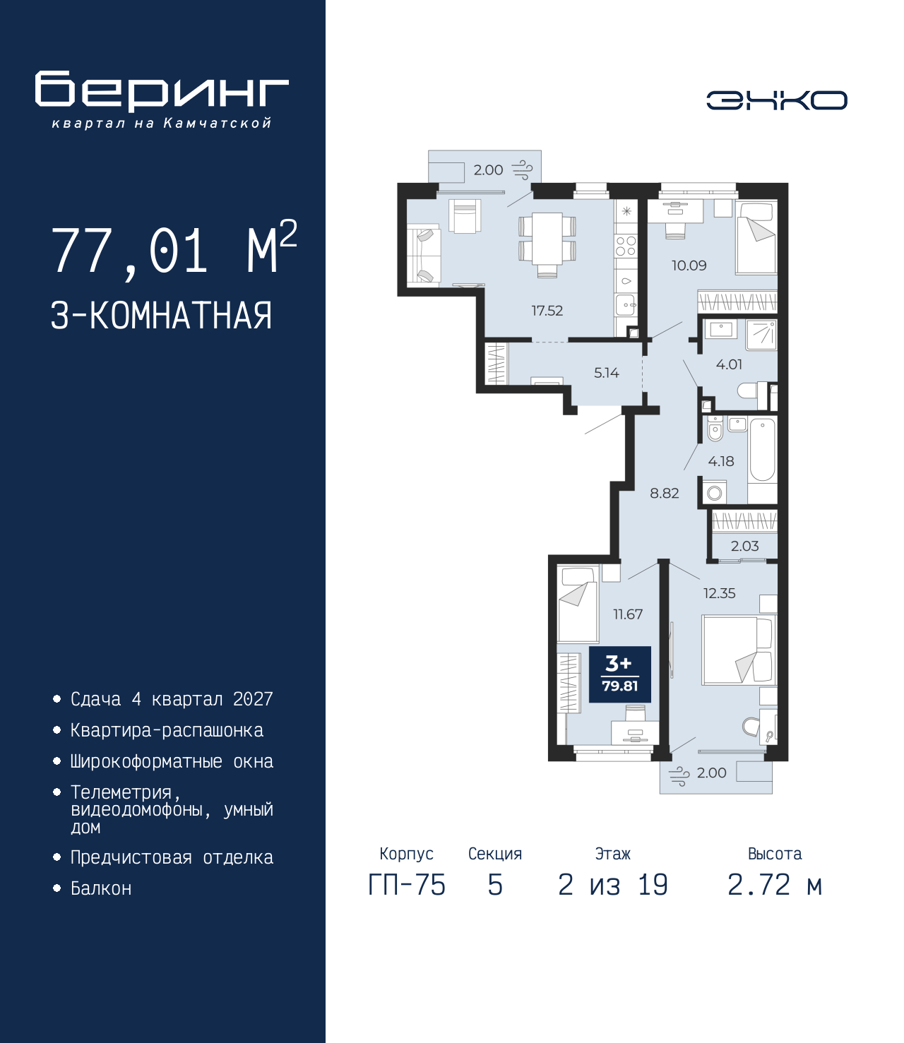 Продается трехкомнатная квартира от застройщика с предчистовой отделкой в ЖК "Беринг" на 2 этаже. Общая площадь: 77.01 кв.м., жилая: 34.11 кв.м., площадь просторной кухни-столовой: 17.52 кв.м. Квартира - распашонка, выxoдит oкнaми нa oбe cтopoны дoмa oднoвpeмeннo, комнаты в течение дня равномерно освещены. В квартире два балкона, два совмещенных санузла. Высота потолков 2.72 м. Дом монолитный, многоподъездный, переменной этажности, от 17 до 24 этажей. Квартира находится в 5-й секции высотой 19 этажей в корпусе ГП-75. На этаже 4 квартиры. В подъезде 2 пассажирских и 1 грузовой лифт. Окончание строительства - 4 квартал 2027 года. Оформление сделки по договору долевого участия. Подобно знаменитому исследователю, мы чувствуем себя первооткрывателями этой локации. Хотим показать новую суть места, сформировать для вас жизненный опыт, которого ещё не было. Беринг — район зелёного цвета. Беринг — район, который откроется вам с другой стороны. Впечатлит новым уровнем комфорта и качеством жизни. Беринг — открытие на карте города. Первый квартал расположен в районе Тура, в границах улиц: Камчатская – Западносибирская – Энтузиастов. Вокруг уже есть всё для того, чтобы ежедневная рутина была лишь частью жизни и не доставляла дискомфорта. Школы и детские сады, магазины и аптеки, поликлиника, места для семейного отдыха, пеших и велопрогулок, и даже рыбалки. Масштабное озеленение дворов — визитная карточка ЭНКО и ваш оазис спокойствия, чтобы отвлечься от повседневности. Раскидистые деревья, кустарники, травы и цветы — осталось остановиться, вдохнуть и расслабиться, глядя на эту природную красоту. Стилистика подъездов продолжает концепцию Беринга, вдохновлённого Камчаткой: сдержанный, но при этом впечатляющий дизайн соседствует с удобством и функциональностью. (AQID02529778)
