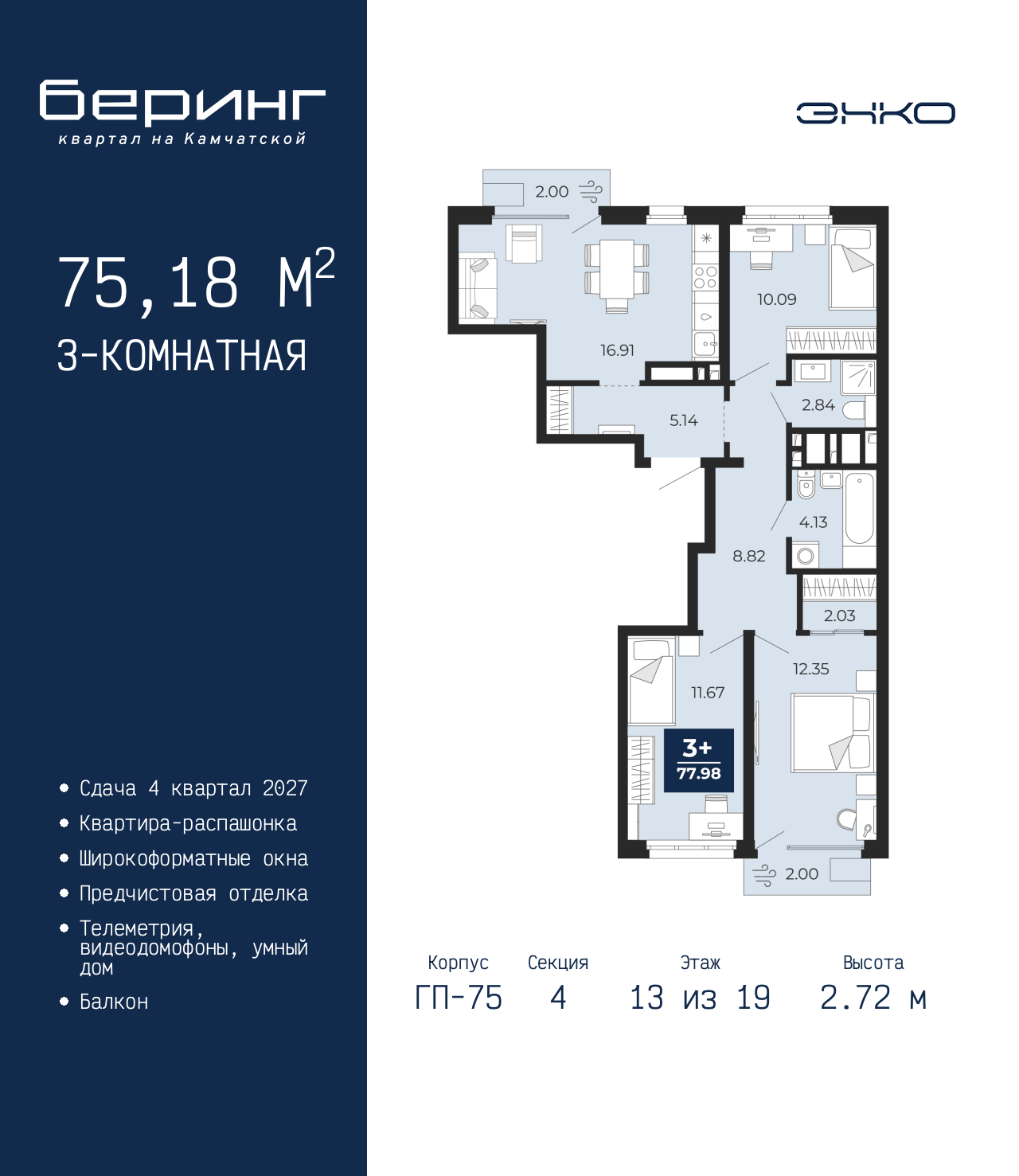Просторная трехкомнатная квартира с предчистовой отделкой в ЖК "Беринг" на 13 этаже. Общая площадь: 75.18 кв.м., жилая: 34.11 кв.м., площадь просторной кухни-столовой: 16.91 кв.м. Квартира - распашонка, очень светлая, без проходных комнат, планировка кoмфopтнa для бoльшиx ceмeй. В квартире два балкона, два совмещенных санузла. Высота потолков 2.72 м. Дом монолитный, многоподъездный, переменной этажности, от 17 до 24 этажей. Квартира находится в 4-й секции высотой 19 этажей в корпусе ГП-75. На этаже 4 квартиры. В подъезде 2 пассажирских и 1 грузовой лифт. Окончание строительства - 4 квартал 2027 года. Оформление сделки по договору долевого участия. Подобно знаменитому исследователю, мы чувствуем себя первооткрывателями этой локации. Хотим показать новую суть места, сформировать для вас жизненный опыт, которого ещё не было. Беринг — район зелёного цвета. Беринг — район, который откроется вам с другой стороны. Впечатлит новым уровнем комфорта и качеством жизни. Беринг — открытие на карте города. Первый квартал расположен в районе Тура, в границах улиц: Камчатская – Западносибирская – Энтузиастов. Вокруг уже есть всё для того, чтобы ежедневная рутина была лишь частью жизни и не доставляла дискомфорта. Школы и детские сады, магазины и аптеки, поликлиника, места для семейного отдыха, пеших и велопрогулок, и даже рыбалки. Масштабное озеленение дворов — визитная карточка ЭНКО и ваш оазис спокойствия, чтобы отвлечься от повседневности. Раскидистые деревья, кустарники, травы и цветы — осталось остановиться, вдохнуть и расслабиться, глядя на эту природную красоту. Стилистика подъездов продолжает концепцию Беринга, вдохновлённого Камчаткой: сдержанный, но при этом впечатляющий дизайн соседствует с удобством и функциональностью. (AQID02529785)