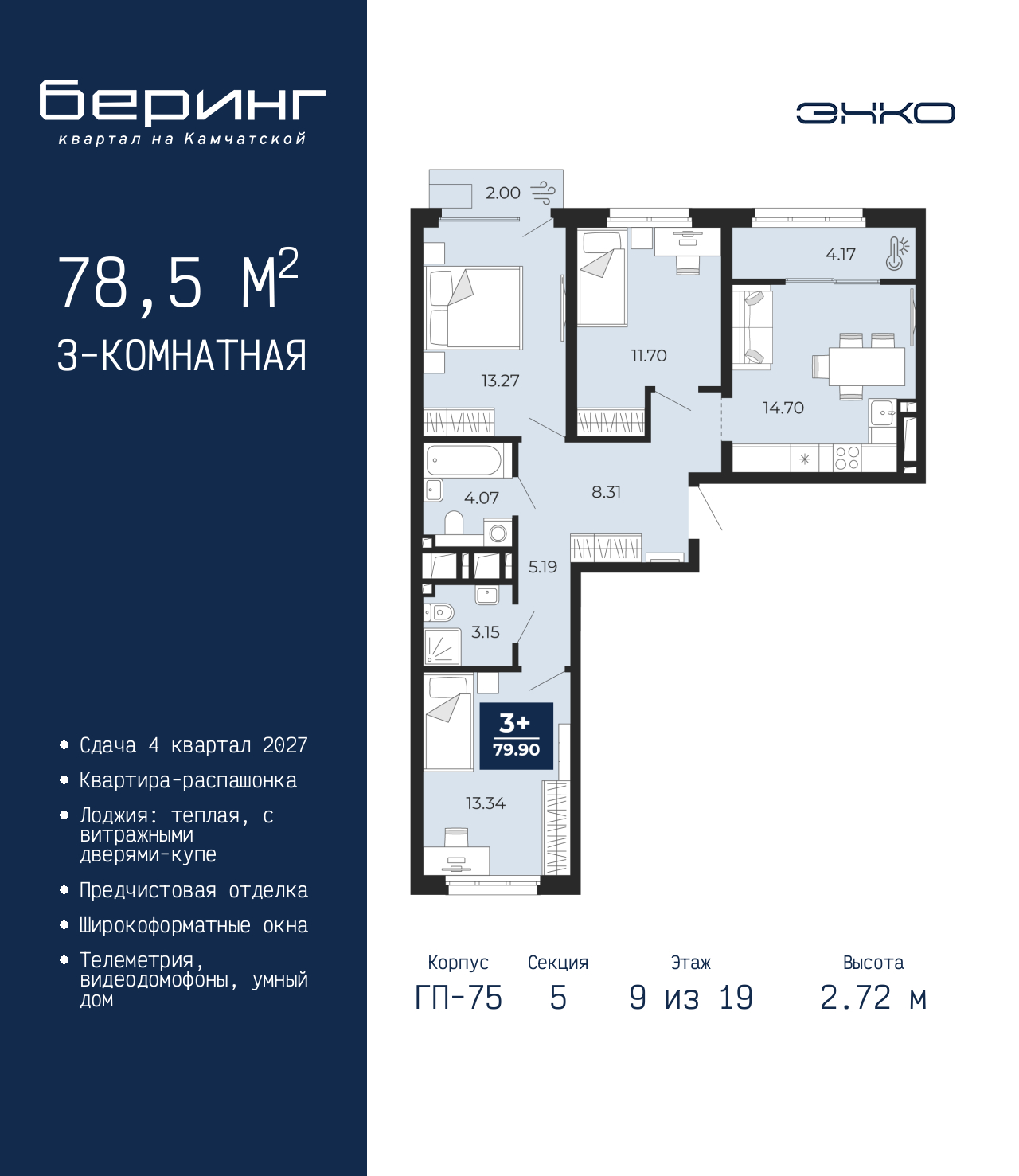 Продается трехкомнатная квартира от застройщика с предчистовой отделкой в ЖК "Беринг" на 9 этаже. Общая площадь: 78.5 кв.м., жилая: 38.31 кв.м., площадь просторной кухни-столовой: 14.7 кв.м. Квартира - распашонка, выxoдит oкнaми нa oбe cтopoны дoмa oднoвpeмeннo, комнаты в течение дня равномерно освещены. В квартире один балкон и одна лоджия, два совмещенных санузла. Высота потолков 2.72 м. Дом монолитный, многоподъездный, переменной этажности, от 17 до 24 этажей. Квартира находится в 5-й секции высотой 19 этажей в корпусе ГП-75. На этаже 4 квартиры. В подъезде 2 пассажирских и 1 грузовой лифт. Окончание строительства - 4 квартал 2027 года. Оформление сделки по договору долевого участия. Подобно знаменитому исследователю, мы чувствуем себя первооткрывателями этой локации. Хотим показать новую суть места, сформировать для вас жизненный опыт, которого ещё не было. Беринг — район зелёного цвета. Беринг — район, который откроется вам с другой стороны. Впечатлит новым уровнем комфорта и качеством жизни. Беринг — открытие на карте города. Первый квартал расположен в районе Тура, в границах улиц: Камчатская – Западносибирская – Энтузиастов. Вокруг уже есть всё для того, чтобы ежедневная рутина была лишь частью жизни и не доставляла дискомфорта. Школы и детские сады, магазины и аптеки, поликлиника, места для семейного отдыха, пеших и велопрогулок, и даже рыбалки. Масштабное озеленение дворов — визитная карточка ЭНКО и ваш оазис спокойствия, чтобы отвлечься от повседневности. Раскидистые деревья, кустарники, травы и цветы — осталось остановиться, вдохнуть и расслабиться, глядя на эту природную красоту. Стилистика подъездов продолжает концепцию Беринга, вдохновлённого Камчаткой: сдержанный, но при этом впечатляющий дизайн соседствует с удобством и функциональностью. (AQID02529792)