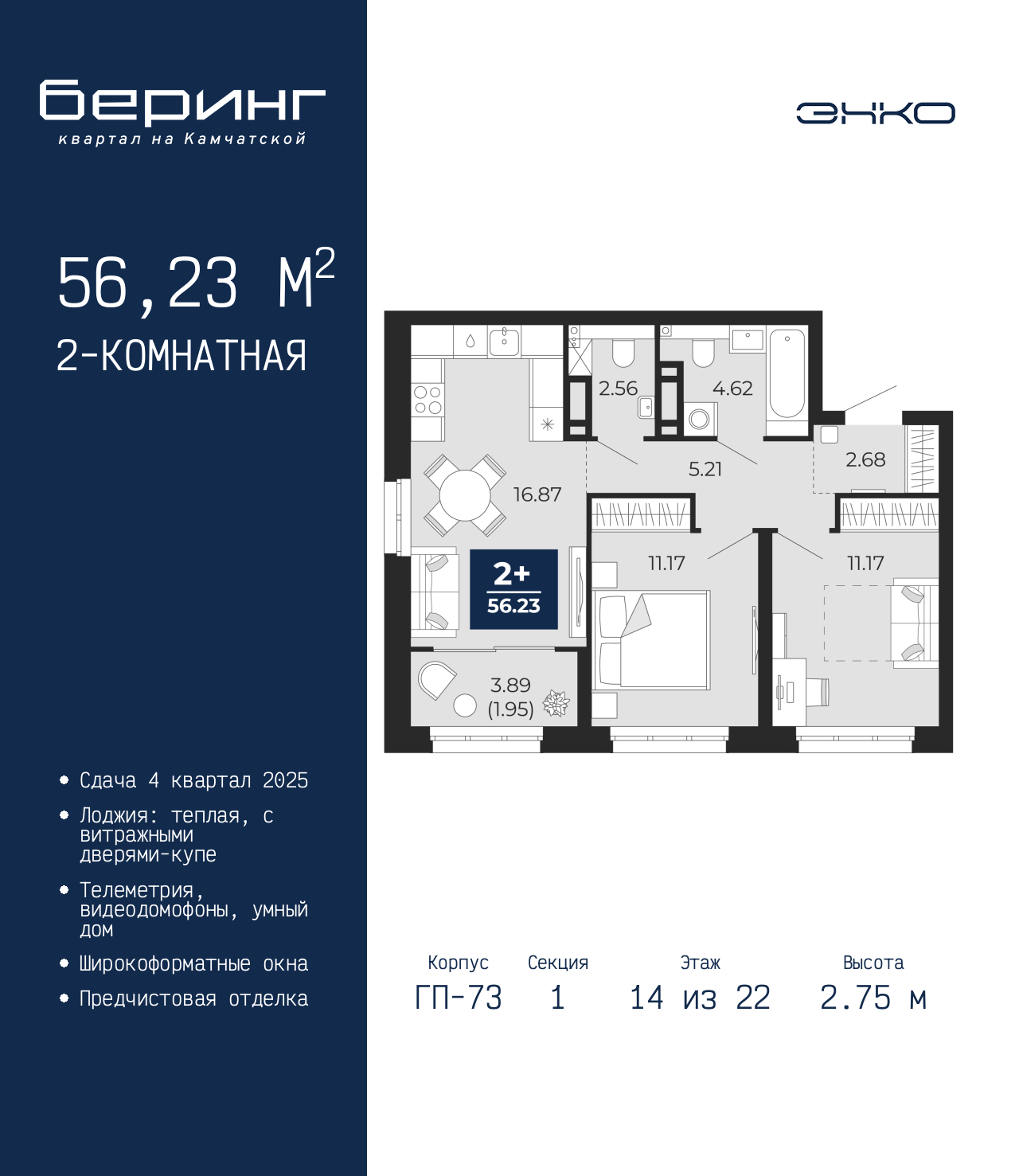 Двухкомнатная квартира с предчистовой отделкой в ЖК "Беринг" на 14 этаже. Общая площадь: 56.23 кв.м., жилая: 22.34 кв.м., площадь просторной кухни-столовой: 16.87 кв.м. Угловая квартира, идеально подойдет любителям тишины и панорамных видов. В квартире одна лоджия, один совмещенный и один раздельный санузел. Высота потолков 2.75 м. Дом монолитный, многоподъездный, переменной этажности, от 9 до 22 этажей. Квартира находится в 1-й секции высотой 22 этажа в корпусе ГП-73. На этаже 5 квартир. В подъезде 1 пассажирский и 1 грузовой лифт. Окончание строительства - 4 квартал 2025 года. Оформление сделки по договору долевого участия. Подобно знаменитому исследователю, мы чувствуем себя первооткрывателями этой локации. Хотим показать новую суть места, сформировать для вас жизненный опыт, которого ещё не было. Беринг — район зелёного цвета. Беринг — район, который откроется вам с другой стороны. Впечатлит новым уровнем комфорта и качеством жизни. Беринг — открытие на карте города. Первый квартал расположен в районе Тура, в границах улиц: Камчатская – Западносибирская – Энтузиастов. Вокруг уже есть всё для того, чтобы ежедневная рутина была лишь частью жизни и не доставляла дискомфорта. Школы и детские сады, магазины и аптеки, поликлиника, места для семейного отдыха, пеших и велопрогулок, и даже рыбалки. Масштабное озеленение дворов — визитная карточка ЭНКО и ваш оазис спокойствия, чтобы отвлечься от повседневности. Раскидистые деревья, кустарники, травы и цветы — осталось остановиться, вдохнуть и расслабиться, глядя на эту природную красоту. Стилистика подъездов продолжает концепцию Беринга, вдохновлённого Камчаткой: сдержанный, но при этом впечатляющий дизайн соседствует с удобством и функциональностью. (AQID02316038)