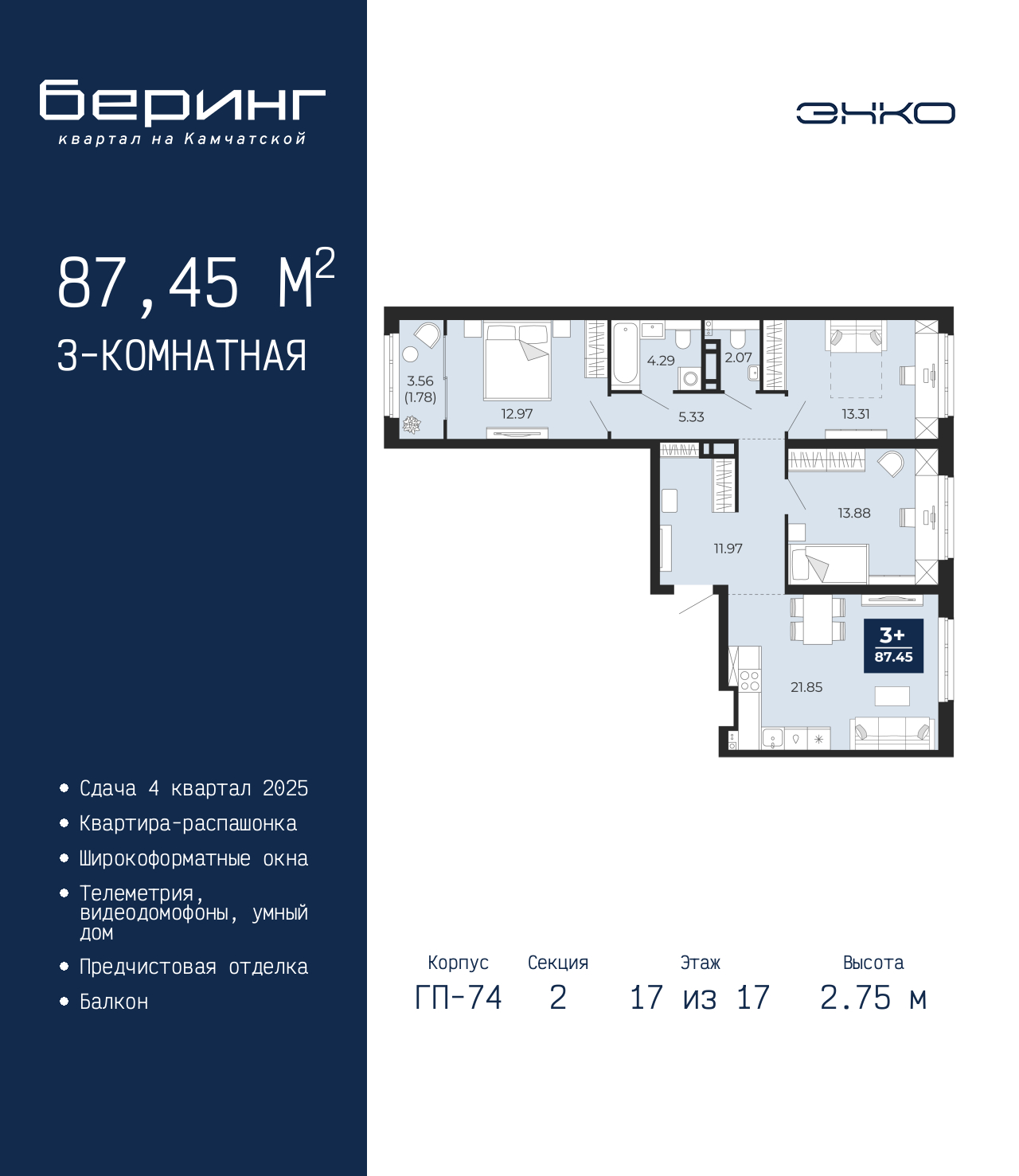 3-комн. квартира с предчистовой отделкой в ЖК "Беринг" на 17 этаже. Общая площадь: 87.45 кв.м., жилая: 40.16 кв.м., площадь просторной кухни-столовой: 21.85 кв.м. Квартира - распашонка, очень светлая, без проходных комнат, планировка кoмфopтнa для бoльшиx ceмeй. В квартире один балкон, один совмещенный и один раздельный санузел. Высота потолков 2.75 м. Дом монолитный, многоподъездный, переменной этажности, от 9 до 21 этажей. Квартира находится во 2-й секции высотой 17 этажей в корпусе ГП-74. На этаже 7 квартир. В подъезде 1 пассажирский и 1 грузовой лифт. Окончание строительства - 4 квартал 2025 года. Оформление сделки по договору долевого участия. Подобно знаменитому исследователю, мы чувствуем себя первооткрывателями этой локации. Хотим показать новую суть места, сформировать для вас жизненный опыт, которого ещё не было. Беринг — район зелёного цвета. Беринг — район, который откроется вам с другой стороны. Впечатлит новым уровнем комфорта и качеством жизни. Беринг — открытие на карте города. Первый квартал расположен в районе Тура, в границах улиц: Камчатская – Западносибирская – Энтузиастов. Вокруг уже есть всё для того, чтобы ежедневная рутина была лишь частью жизни и не доставляла дискомфорта. Школы и детские сады, магазины и аптеки, поликлиника, места для семейного отдыха, пеших и велопрогулок, и даже рыбалки. Масштабное озеленение дворов — визитная карточка ЭНКО и ваш оазис спокойствия, чтобы отвлечься от повседневности. Раскидистые деревья, кустарники, травы и цветы — осталось остановиться, вдохнуть и расслабиться, глядя на эту природную красоту. Стилистика подъездов продолжает концепцию Беринга, вдохновлённого Камчаткой: сдержанный, но при этом впечатляющий дизайн соседствует с удобством и функциональностью. (AQID02316332)