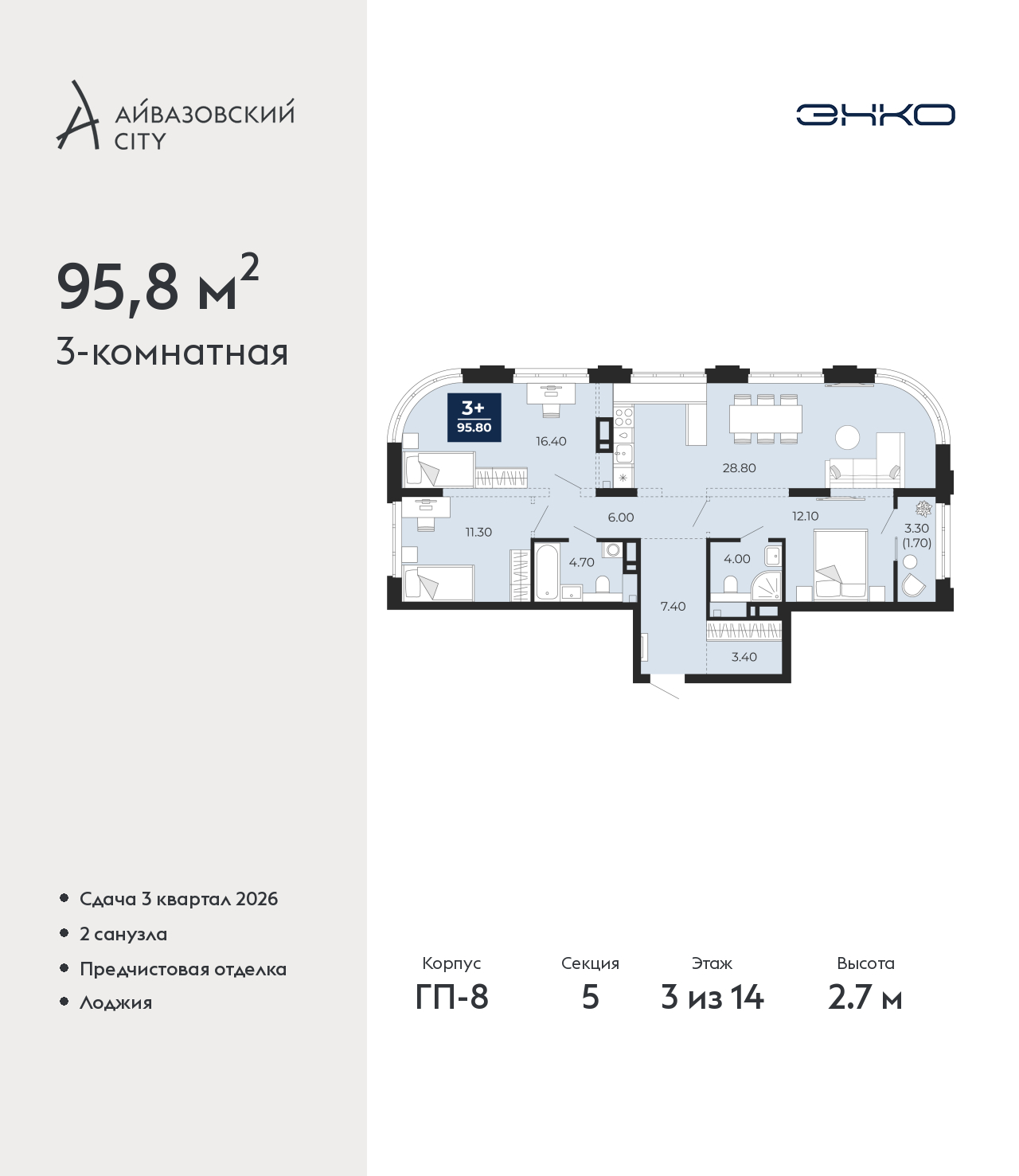 3-комн. квартира с предчистовой отделкой в ЖК "Айвазовский City" на 3 этаже. Общая площадь: 95.8 кв.м., жилая: 39.8 кв.м., площадь просторной кухни-столовой: 28.8 кв.м. Квартира без проходных комнат, окна выходят нa три cтopoны дома. В квартире одна лоджия, два совмещенных санузла. Высота потолков 2.7 м. Дом монолитный, многоподъездный, переменной этажности, от 14 до 24 этажей. Квартира находится в 5-й секции высотой 14 этажей в корпусе ГП-8. На этаже 5 квартир. В подъезде 1 пассажирский и 1 грузовой лифт. Окончание строительства - 3 квартал 2026 года. Оформление сделки по договору долевого участия. Новый жилой район располагается в живописном месте на берегу Туры в центральной части города. Принципиально новое пространство для жизни в центре современного города для тех, чьи мечты сбываются, кто нацелен на постоянный рост, перемены к лучшему для себя и своих близких. Каждая деталь Айвазовский City вдохновляет и заряжает на новые свершения: авторская архитектура, сбалансированная продуманная инфраструктура, дизайнерские дворы со спортивными и детскими площадками, парковые зоны с фонтанами, водный канал, украшающий центральный прогулочный маршрут района и многое другое. В 2019 года проект стал лауреатом престижной премии Urban Awards 2019 в номинации «Лучший строящийся региональный жилой комплекс бизнес-класса». Главная особенность Айвазовский City - соседство разных архитектурных школ в рамках одного дома. Изысканная классика, выразительная эклектика и оригинальный модерн - жить в одном из таких домов настоящий повод для гордости. Айвазовский City это идеальное сочетание комфорта, технологий и развитой инфраструктуры. Вход в подъезд возможен с улицы и со двора. Отправляясь на работу или за покупками, жители могут выйти с внешней стороны дома, а для прогулки с ребенком – со стороны двора. Экологически чистые материалы и энергосберегающие технологии, качественное освещение общественных зон, видеонаблюдение по всей территории жилого района (в том числе в подъездах, лифтах и в подземном паркинге), закрытые дворы с доступом только для жителей Айвазовский City. Часть домов в Айвазовский City будут оснащены подземным паркингом. Востребованный в нашем климатическом поясе формат хранения автомобилей защитит собственность владельца в любое время года. Аккредитация в банках: ОАО «Альфа-Банк», «Сбербанк России», ПАО «Газпромбанк», ПАО Банк «ВТБ», АО "ДОМ.РФ" и других. (AQID02403838)